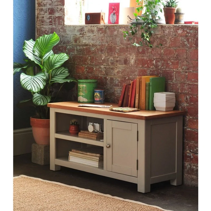 Rustykalna szafka pod telewizor Napoli to mebel pod telewizor zaprojektowany z myślą o niezbyt dużych stylowych wnętrzach, do których wniesie zarówno swoją funkcjonalność, jak i efektowny design. Prosta, harmonijna kompozycja modelu jest doskonałym odniesieniem do klimatu wiejskich domów sprzed lat. Elementem typowym dla mebli rustykalnych jest też naturalny, niebarwiony blat, który wskazuje na wykorzystanie prostych, ale solidnych materiałów, zapewniających trwałość mebla. Wnętrze komody wyposażono w szeroką podwójną półkę parametrami dopasowaną do tunerów i odtwarzaczy. W montażu pomocne okażą się dwa okrągłe otwory umieszczone w tylnej ścianie, pozwalające na wygodne przełożenie kabli. Uzupełnieniem otwartej wnęki z półkami jest nieco mniejsza zamykana szafka przeznaczona do przechowywania kolekcji płyt lub innych akcesoriów do kina domowego. Całość umieszczono na niewysokich czworokątnych nogach stanowiących przedłużenie boków. Elementami dodającymi atrakcyjności szafce i jednocześnie urozmaicającymi jej powierzchnię są charakterystyczne wklęsłe czworokąty w płaszczyźnie drzwiczek i powierzchni bocznych. Rustykalna szafka pod telewizor Napoli to idealny wybór do stylowych aranżacji wnętrz, a także bardzo efektowny mebel o walorach dekoracyjnych i praktycznych.