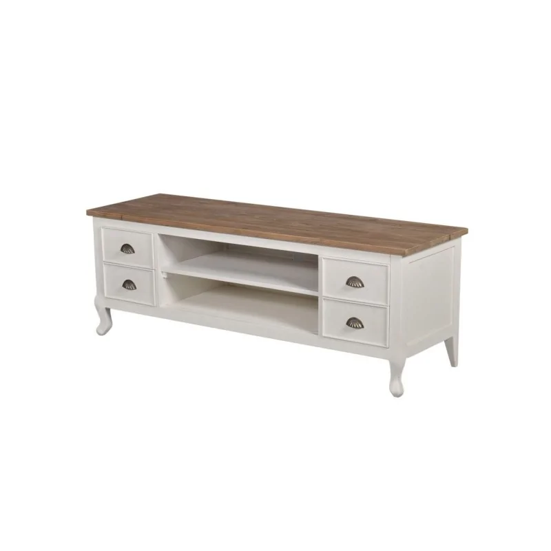 Niebanalna i pełna stylowego wdzięku komoda rtv prowansalska Mio z pewnością będzie piękną ozdobą salonu, w efektowny sposób uzupełniając jego wystrój i zapewniając miejsce na ekspozycję sprzętu elektronicznego. Urok mebla kryje się w jego proporcjach oraz specyficznym dla kompozycji retro połączeniu bieli z naturalnym drewnem blatu. Zastosowane do jego wykonania drewno dębowe wyróżnia się nie tylko pięknym rysunkiem, ale też jest bardzo trwałe i nosi znamiona szlachetności. W komodzie zwracają uwagę jej proporcje, bowiem mebel jest niewysoki w przeciwieństwie do jego długości. Dzięki temu doskonale wypełni wolną przestrzeń jako samodzielny model pod telewizor, ustawiony w centralnym miejscu salonu. Istotnym walorem jest też spora powierzchnia blatu, która pozwala zmieścić jeszcze inne przedmioty poza samym telewizorem. Wnętrze komody tradycyjne zawiera dwie wnęki na odtwarzacze, dekodery i inne elementy zestawu kina domowego. Przy zewnętrznych ściankach swoje miejsce zajmują dwie pary ułożonych kolumnowo szuflad zapewniających praktyczne schowki na piloty, płyty i inne akcesoria. Szufladki nie są duże, ale pojemne dzięki ich sporej wysokości. Prowansalski klimat komody bardzo wyraźnie akcentują ozdobne przednie nóżki ukształtowane na wzór mebli w stylu ludwikowskim. Komoda rtv prowansalska Mio to kwintesencja stylu retro w eleganckiej i pięknej formie.