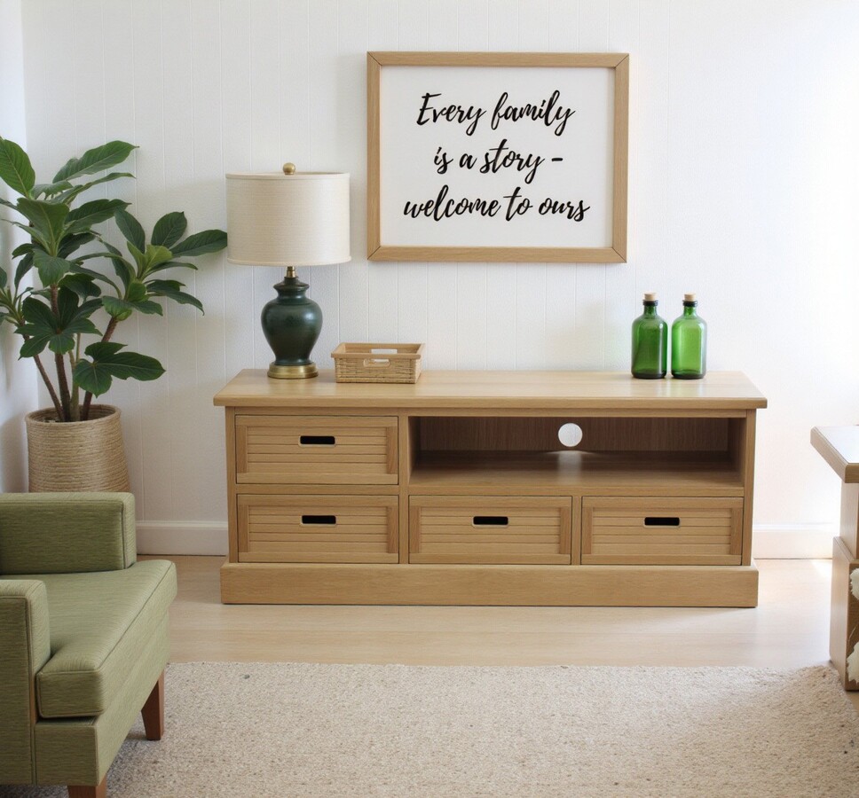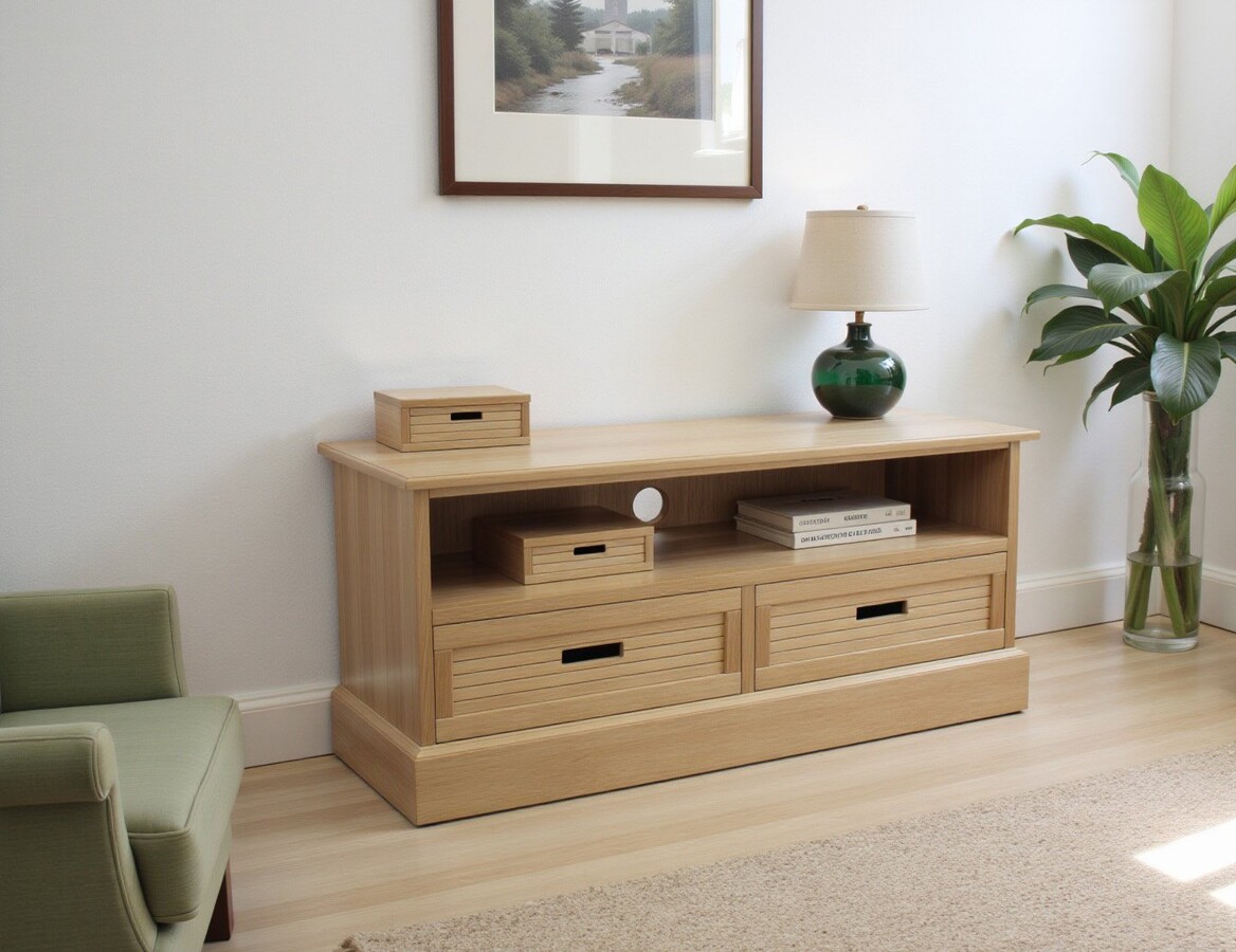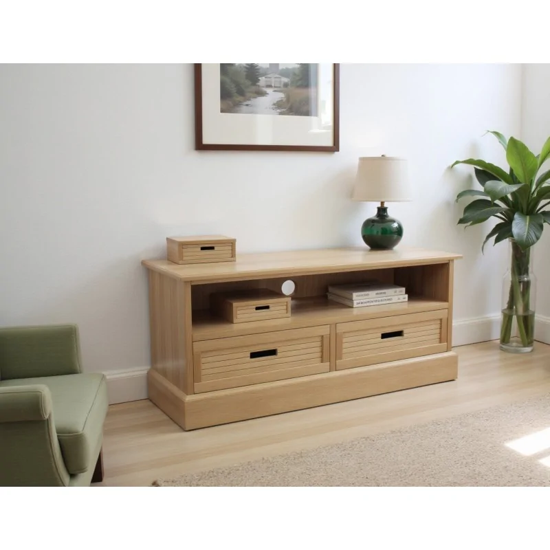 Dębowa szafka RTV Epos 2S zwraca uwagę prostą, lecz wyrazistą formą oraz harmonijnie wkomponowaną wnęką na sprzęt multimedialny. Utrzymana w jasnym odcieniu drewna, prezentuje delikatne usłojenie, podkreślające naturalny urok materiału. Niska podstawa nadaje bryle stabilności, a zaokrąglone krawędzie zapewniają subtelny akcent dekoracyjny.