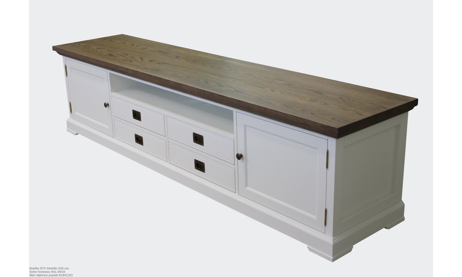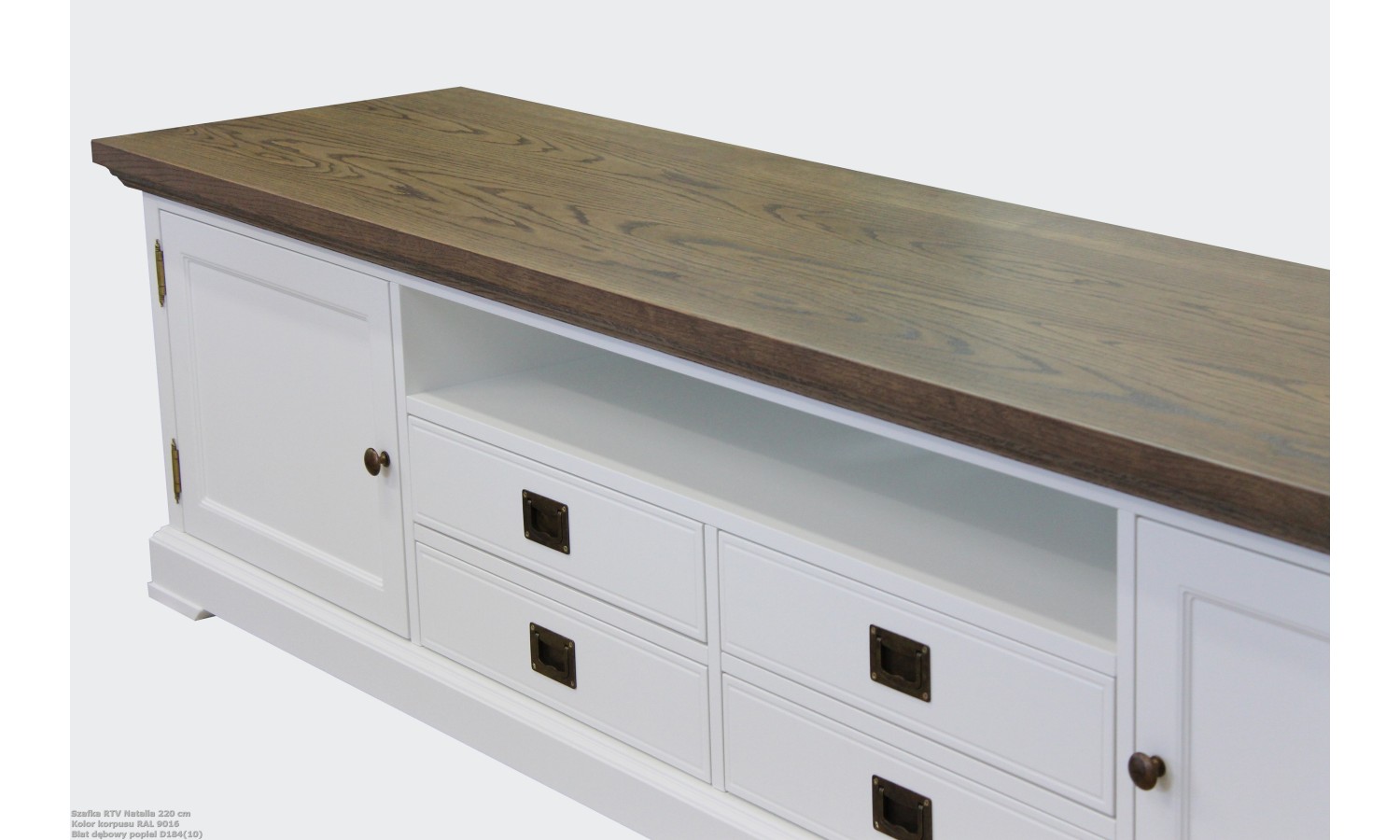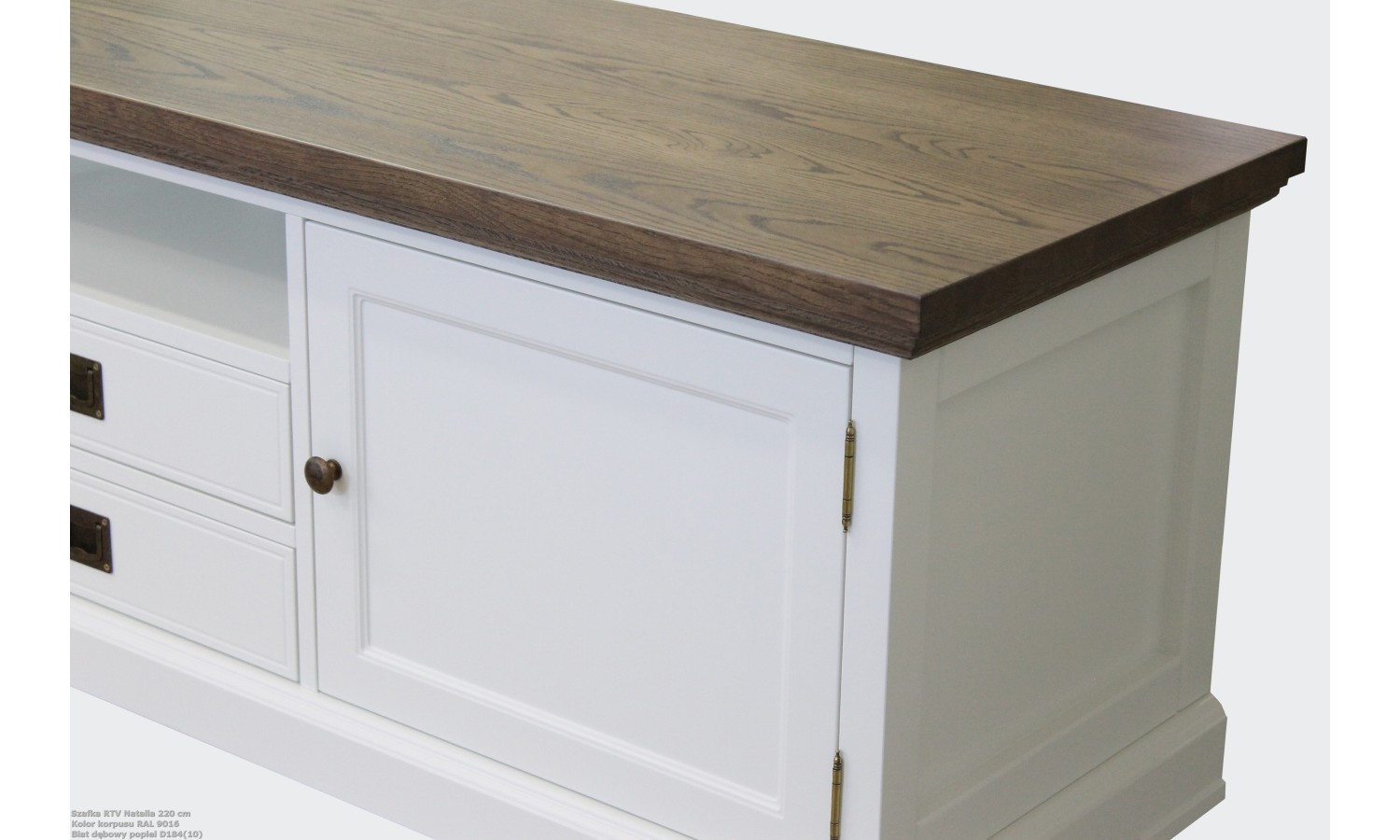 Szafka RTV vintage Natalia na zdjęciu ma delikatne, poszarzane wybarwienie dębu, co nadaje mu subtelny, lekko postarzały charakter — idealny do wnętrz w stylu vintage czy prowansalskim. Jednocześnie, jest oczywiście możliwość wyboru innego wybarwienia blatu, co pozwala dopasować mebel do własnej aranżacji.