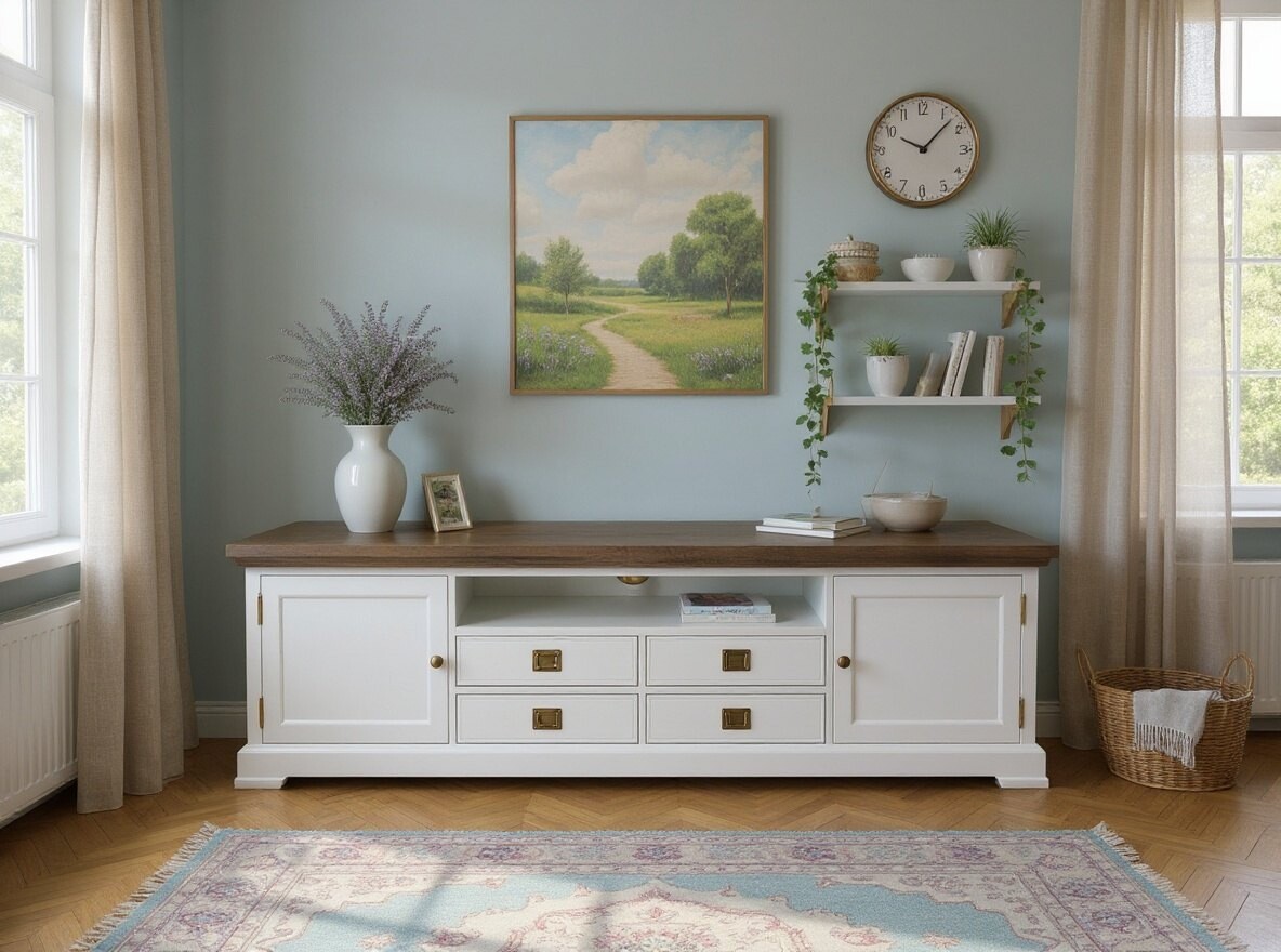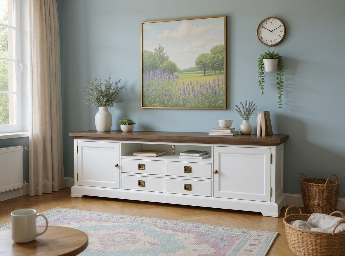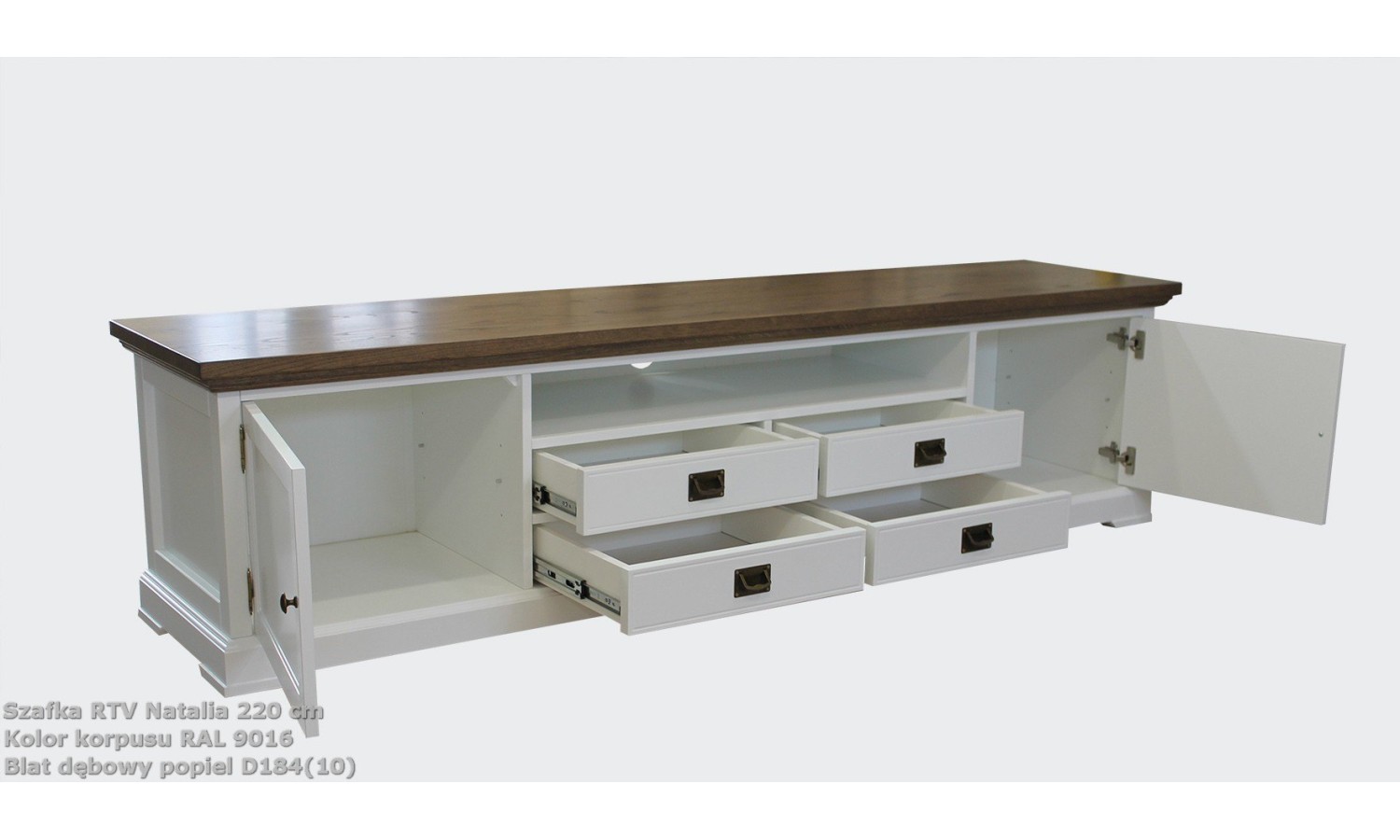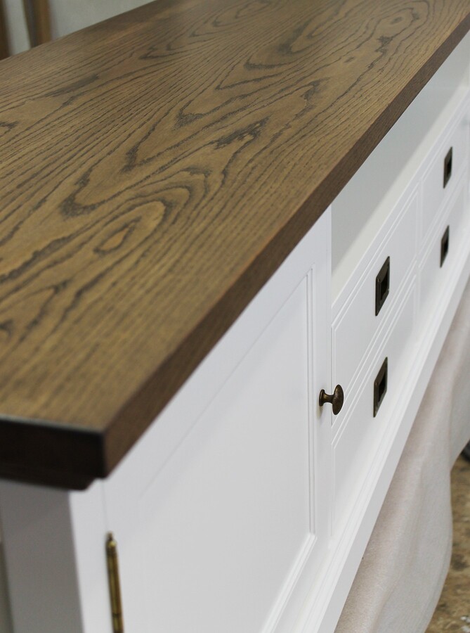 Szafka RTV vintage Natalia na zdjęciu ma delikatne, poszarzane wybarwienie dębu, co nadaje mu subtelny, lekko postarzały charakter — idealny do wnętrz w stylu vintage czy prowansalskim. Jednocześnie, jest oczywiście możliwość wyboru innego wybarwienia blatu, co pozwala dopasować mebel do własnej aranżacji.