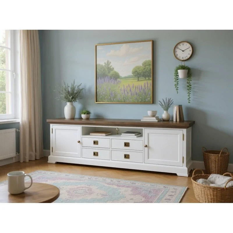 Szafka RTV vintage Natalia to stylowy mebel w klimacie klasycznym z delikatnym uszlachetnieniem retro. Zaprojektowana została z myślą o stworzeniu eleganckiej bazy pod sprzęt multimedialny w salonie, łączącej funkcjonalność z dekoracyjnym charakterem.
