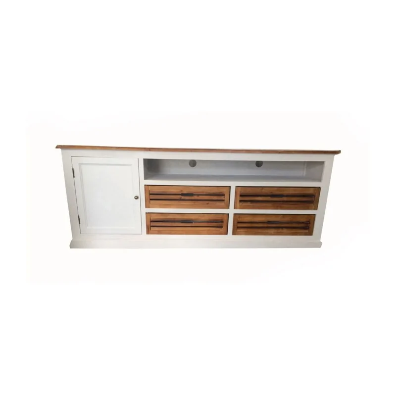 Szafka RTV Epos stanowi typowy przykład mebla z początku ubiegłego wieku, wyróżniającego się cechami definiującymi wiejski styl wielu rejonów kontynentu. W kompozycji zaznaczają swoją obecność zarówno cechy rustykalne, jak i prowansalskie czy skandynawskie. Szafka zaprojektowana jest wbrew zasadom symetrii, bowiem jej wnętrze wypełnia pojedyncza zamykana szafka oraz zajmujący większą część zestaw półek, z których ta położona najwyżej jest szeroką pustą wnęką na sprzęt elektroniczny, a ułożone parami cztery niższe wnęki wypełniają szuflady-skrzynie. To zarówno praktyczny, jak i dekoracyjny element designu, wykonany z niebarwionego drewna z efektownymi ażurowymi frontami. Szuflady idealnie współistnieją z naturalnym blatem w tym samym odcieniu, dodając odrobinę typowego dla drewna ciepła do chłodnej białej stylizacji modelu. Praktycznym dodatkiem do górnej wnęki są dwa niewielkie otwory w tylnej ściance umożliwiające przełożenie kabli instalacyjnych. Epos to szafka RTV, która każdym swoim detalem podkreśla związek z przeszłością doskonale komponując się z każdym wnętrzem retro lub vintage.