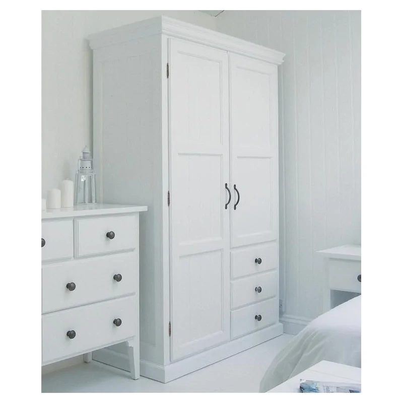Piękna biała szafa do sypialni Fran to idealny mebel do jasnej, przytulnej sypialni w stylu skandynawskim lub angielskim, łączący w sobie typowe cechy wzornictwa z początku ubiegłego wieku. To idealny mariaż czystej bieli z masywnymi zwieńczeniami modelu oraz bardzo charakterystyczną fakturą drzwi, uzyskaną poprzez szereg długich pionowych rowków. Taka stylizacja nie tylko jest definicją stylu skandynawskiego, ale też nasuwa skojarzenia z układem desek, czyli meblem wykonanym z naturalnego drewna, typowego dla stylizacji z przeszłości. Biała szafa do sypialni Fran to świetny mebel rozjaśniający wystrój sypialni, ale również podnoszący jej komfort przez zapewnienie miejsca na odzież i różne podręczne przedmioty. To asymetryczna dwuczęściowa kompozycja, z wypełniającą całą wysokość mebla częścią na wieszaki i wysoką szafką uzupełnioną dwiema szufladami. Połączenie wieszaków z szafką i szufladami sprawia, że mebel jest uniwersalny, zaspokajając potrzebę przechowywania odzieży w każdym jej aspekcie. Efektowne zwieńczenie dołu i góry mebla dodaje mu wdzięku i stabilności, a pięknie wykończone boki sprawiają, że szafa Fran doskonale zaprezentuje się również samodzielnie, z dala od innych mebli.