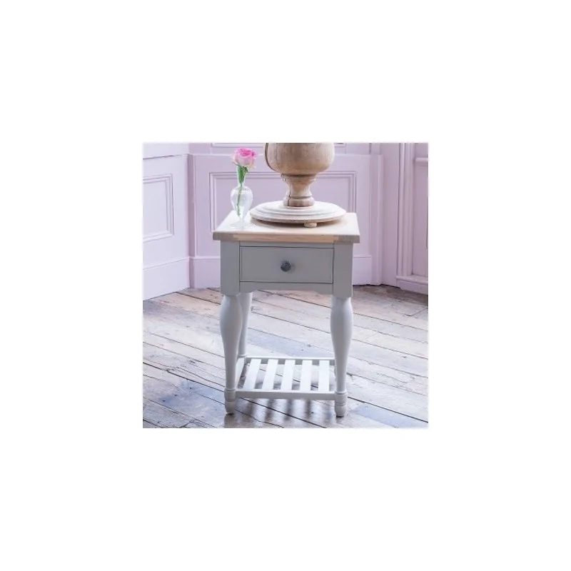 Rustykalny stolik nocny Alicja to prawdziwa perełka wśród stylowych mebli do sypiali. Model wyróżni się niewielką powierzchnią blatu, dzięki czemu nie zajmuje zbyt wiele miejsca i nie wydaje się masywny - pomimo toczonych nóg i ciężkiej podstawy blatu. Kompozycja mebla opiera się na solidnych elementach, które tworzą przyjemną wizualnie całość. Trudno w nim szukać delikatnych detali, a każdy element potwierdza prostotę i solidność konstrukcji, która – zgodnie z zasadami wzornictwa prowansalskiego – ma być komfortowa i trwała. Rustykalny stolik nocny w przyjemnym białym kolorze został uzupełniony naturalnym drewnianym blatem, który z jednej strony wprowadza przyjemny ciepły akcent do całości, a z drugiej jest subtelnym nawiązaniem do natury. Toczone nogi nie mają w sobie nic z delikatności, dzięki czemu stolik sprawia wrażenie bardzo wytrzymałego i bezpiecznego. Szuflada pod blatem to praktyczny i pojemny schowek na podręczne drobiazgi. Atrakcyjności meblowi dodaje ażurowa dolna półka, na której można postawić efektowną dekorację lub bardziej praktyczny przedmiot.