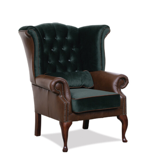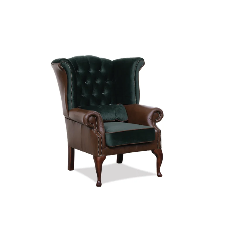 Fotel Chesterfield z pikowanym oparciem Wiktoria to kwintesencja klasycznego designu i wyrafinowanego stylu, który stanie się ozdobą każdego wnętrza. Ten wyjątkowy fotel zachwyca swoją formą, dbałością o detale oraz unikalnym połączeniem materiałów najwyższej jakości. Idealnie wkomponuje się zarówno w eleganckie salony, gabinety, jak i bardziej nowoczesne przestrzenie, dodając im szyku i klasy. Już na pierwszy rzut oka fotel Wiktoria robi niezapomniane wrażenie dzięki pikowanemu oparciu, które jest znakiem rozpoznawczym stylu Chesterfield. Głębokie pikowania dodają meblowi elegancji i luksusu, a jednocześnie nadają mu miękkości i wygody. Oparcie wykonane z aksamitnej tkaniny w głębokim odcieniu zieleni tworzy efektowny kontrast z brązową, naturalną skórą, która zdobi boczne części fotela oraz podłokietniki. Takie zestawienie kolorów i faktur tworzy harmonijną kompozycję, która przyciąga wzrok i podkreśla ekskluzywny charakter mebla.