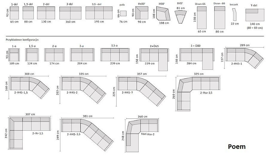 - Meble z kolekcji Poem można dowolnie konfigurować, wg załączonych schematów modułów.