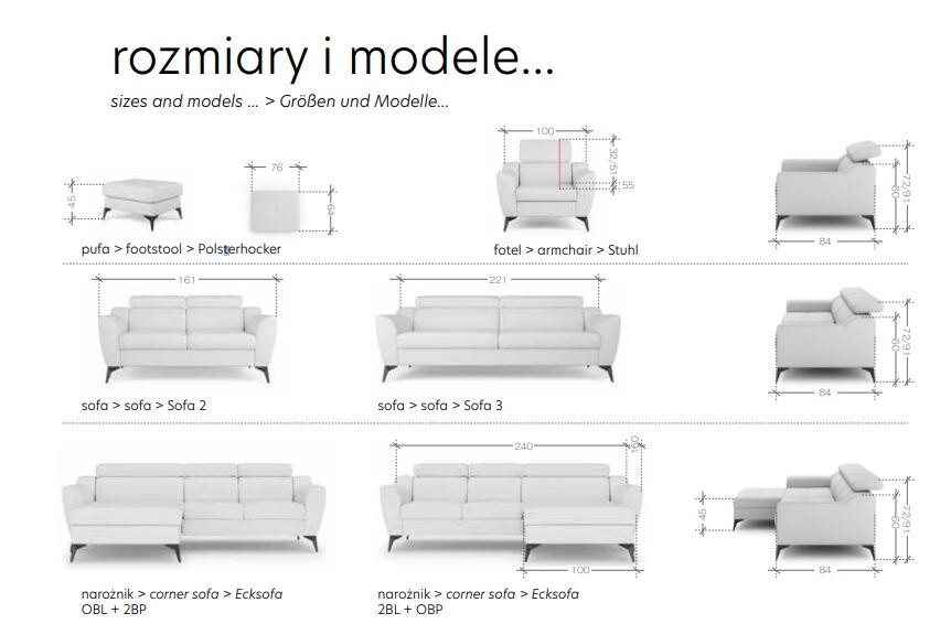 Kolekcja Madera oferuje szeroki wybór mebli, które można dopasować do różnych potrzeb i przestrzeni. W ramach kolekcji dostępne są również narożnik Madera o wymiarach 240x160 cm, trzyosobowa sofa o długości 221 cm, dwuosobowa sofa o długości 161 cm oraz pufa o wymiarach 76x64 cm. Możliwość wykonania mebli w różnych kolorach tkanin i ekoskór pozwala na pełne dostosowanie ich do stylu i charakteru wnętrza. Dzięki wysokiej jakości materiałom i solidnemu wykonaniu, meble z kolekcji Madera są trwałe i odporne na codzienne użytkowanie, zachowując jednocześnie elegancki wygląd przez wiele lat.