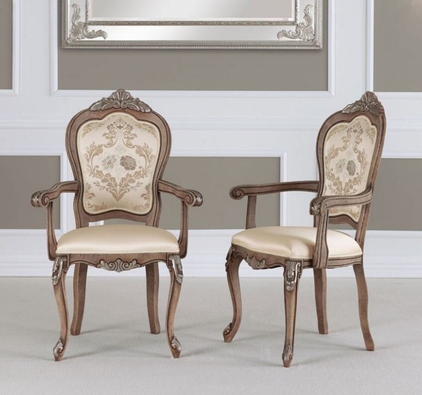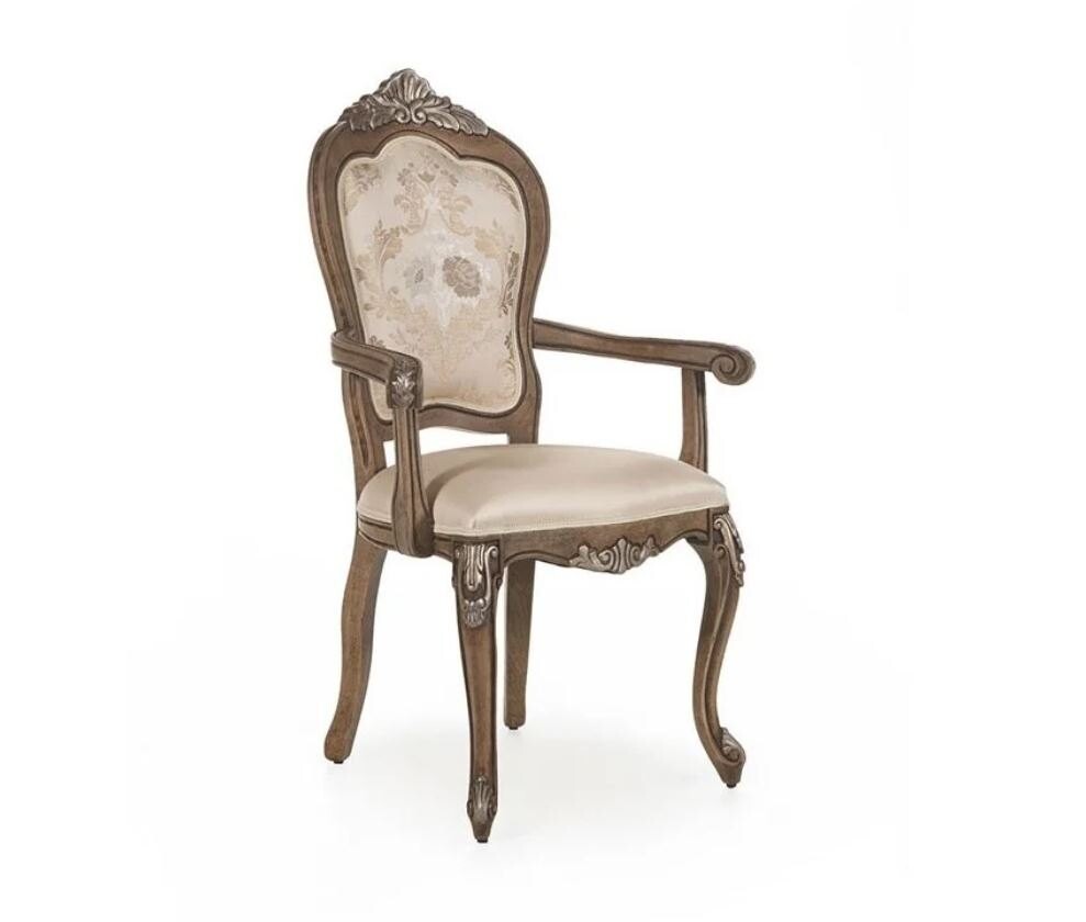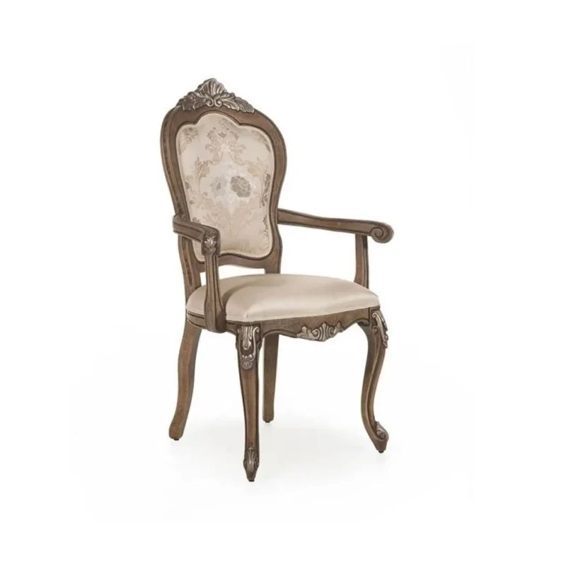 Stylowe krzesło z podłokietnikami Kronos to klasyczny mebel o subtelnej linii, który zachwyca starannością wykonania i eleganckim wzornictwem. Rama krzesła, wykonana z litego drewna bukowego, została wzbogacona o delikatne rzeźbienia, które dodają mu wyrafinowanego charakteru. Miękkie, tapicerowane siedzisko oraz oparcie zdobi tkanina w elegancki, klasyczny wzór, zapewniając komfort użytkowania oraz przyciągając wzrok detalami. Profilowane podłokietniki nie tylko podkreślają finezyjny design, ale również podnoszą funkcjonalność, czyniąc mebel idealnym wyborem do jadalni lub salonu.