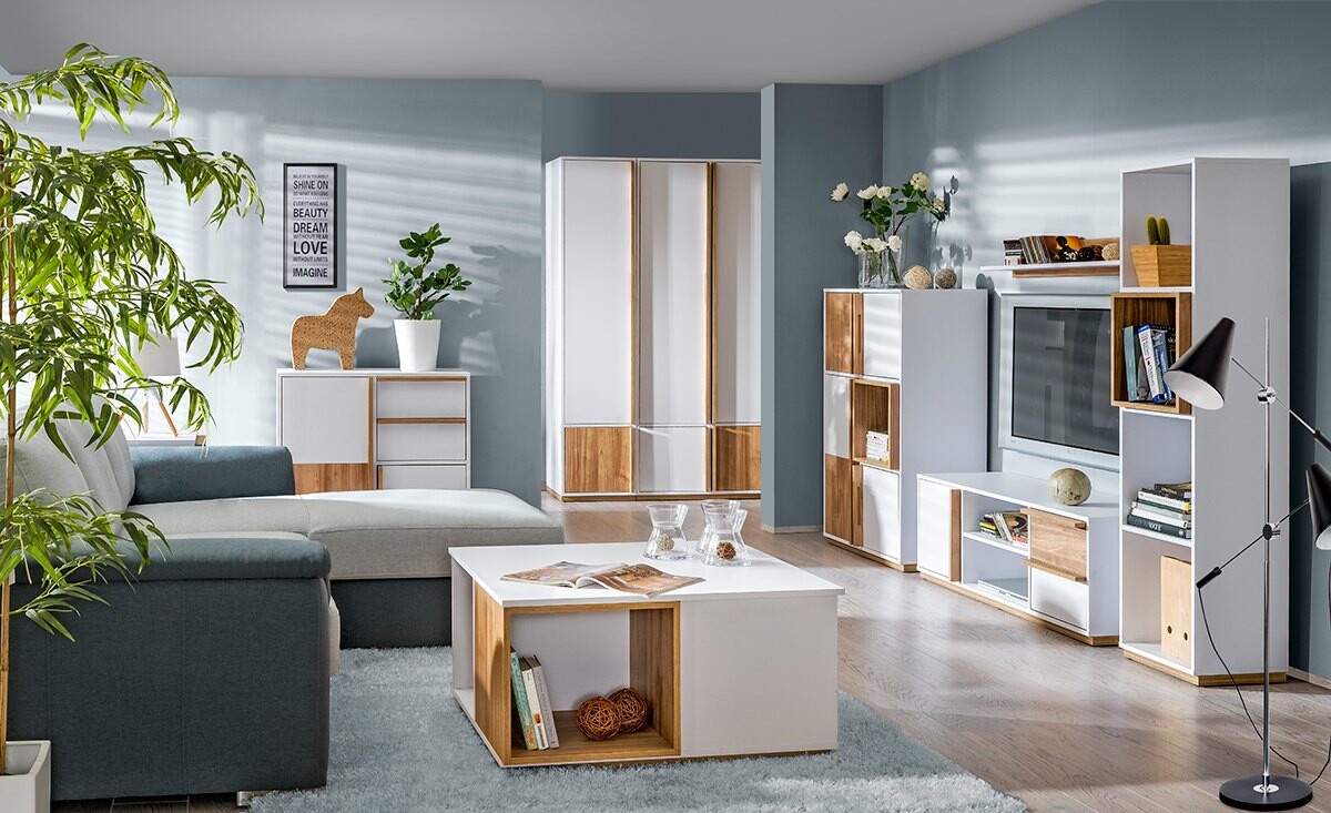 - Kolorystyka mebli Spenser: Orzech Select + Biały Brylantowy
