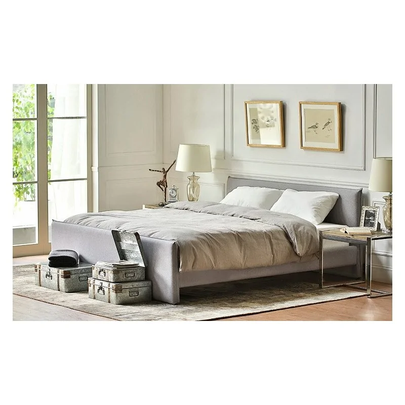 Tapicerowane łóżko skandynawskie Gilberto to mebel w stylu skandynawskim, wyróżniający się zarówno prostą formą, jak i typową dla tego wzornictwa kolorystyką. Podstawowa konstrukcja z drewna opiera się na prostym schemacie przypominającym mocno rozciągniętą literę H. Harmonię zaburza nieco podwyższony w stosunku do tyłu zagłówek, jednak oba panele są proste i niezbyt grube, tworząc oprawę dwóch stron łóżka. Mebel jest tapicerowany, a powierzchnia tapicerki pozostaje idealnie gładka, bez dodatkowych przeszyć czy dekoracji. Elementem łagodzącym nieco ten schematyzm są charakterystycznie zaszywane krawędzie tapicerki, tworzące na obrzeżu paneli niewielkie wałeczki. Tapicerowane łóżko skandynawskie Gilberto nie posiada typowych nóg, jednak skrzynia materaca została umieszczona wysoko nad podłogą, opierając się na zagłówku i tylnym panelu. Sama skrzynia nie jest zbyt masywna, podobnie jak umieszczony w jej wnętrzu materac. Dlatego mebel tworzy wrażenie stosunkowo lekkiego i dobrze prezentuje się nawet w niezbyt przestronnych pomieszczeniach. Gilberto to duże, proste łóżko skandynawskie, które idealnie wkomponuje się w surowy biało-szary wystrój wnętrza, zapewniając miejsce do spania zarówno dla dwóch, jak i dla jednej osoby. Model dostępny jest w kilku szerokościach.