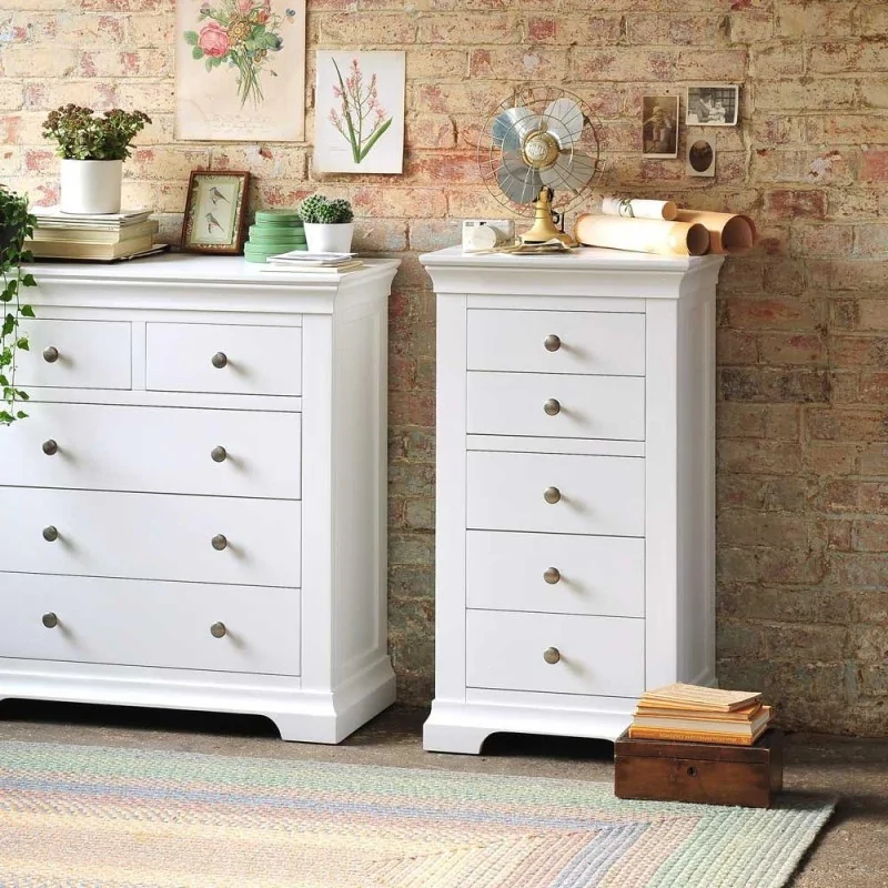 Bonita to efektowna biała komoda skandynawska wyróżniająca się ciekawymi proporcjami, dzięki którym będzie bardzo funkcjonalnym meblem w małych wnętrzach. Atutem modelu jest jego niewielka powierzchnia, która jednak nie ogranicza oferowanego miejsca w szufladach, bowiem chociaż są one nieco mniejsze, to ułożone w wysokiej kolumnie. Komoda skandynawska Bonita mieści w swoim wnętrzu pięć takich szuflad podzielonych na dwie strefy. W wyższej części znajdują się dwie nieco niższe szuflady, w dolnej trzy wyższe, na większe przedmioty. Obie strefy odseparowane są wąską listwą. W meblu bardzo intensywnie zaznaczają się cechy wzornictwa skandynawskiego. Prosta bryła modelu została wkomponowana pomiędzy znacznie szerszy, wysunięty poza jej obrys blat oraz podobną podstawę. Krawędź przy podłodze została wycięta zaznaczając obecność nóg, a przy okazji dodając bryle nieco lekkości. Wysunięty blat umieszczony jest na wysokiej lekko wyokrąglonej podstawie, która zapewnia płynne przejście od ścian komody do krawędzi blatu. Atrakcyjny dodatek stanowią czworokątne wgłębienia w bocznych ścianach, które urozmaicają wysokie powierzchnie. Komoda skandynawska jest nie tylko piękna, ale też swoją obecnością w bardzo znaczący sposób podkreśla stylowy charakter wnętrza. To również mebel, przy którym łatwo można utrzymać porządek.
