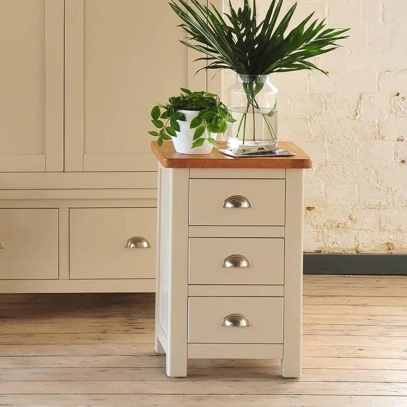 Niewielka i dzięki temu bardzo zgrabna mała komoda z szufladami Napoli jest meblem przeznaczonym do małych pomieszczeń lub jako uzupełnienie znacznie bogatszego kompletu wyposażenia w podobnym stylu. Małe rozmiary zarówno w odniesieniu do wysokości, jak i zajmowanej powierzchni to atut, który pozwala na umieszczenie komody w niewielkiej przestrzeni pomiędzy innymi meblami, w narożniku lub obok łóżka, zastępując klasyczny stolik nocny. Kompozycja mebla oparta jest na zasadach typowych dla stylizacji retro łącząc w sobie tradycyjny kształt przypominający klocek na niewysokich nogach z jasnym drewnianym blatem. Każdy z elementów konstrukcji jest odzwierciedleniem równoległoboku. Jednak elementem urozmaicającym kompozycję oraz dodającym jej miękkości są lekko wyokrąglone narożniki zarówno samej komody, jak i jej blatu czy nóg. Mebel został wyposażony w trzy pojemne szuflady wyraźnie oddzielone od siebie listwami konstrukcji zasadniczej. Każda z szuflad posiada charakterystyczny dla mebli retro metalowy uchwyt w kształcie półkuli zapewniający wygodę odsuwania nawet po wypełnieniu ciężkimi przedmiotami. Mała komoda z szufladami Napoli to mebel, który zachwyca swoim klasycznym pięknem podkreślonym ciepłym odcieniem drewna i wyjątkową starannością wykonania.