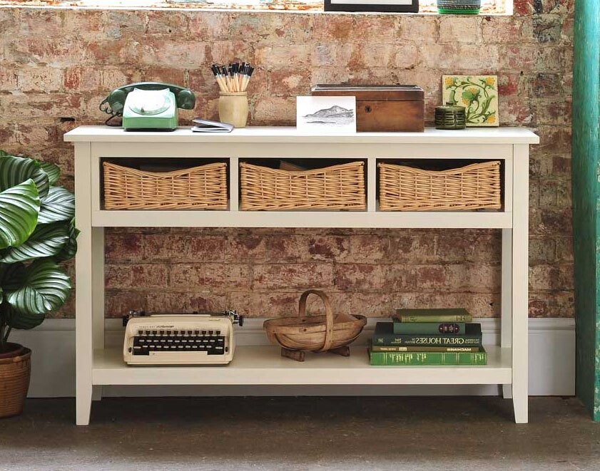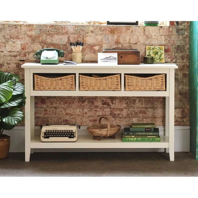 Konsola styl prowansalski Spot będzie efektownym i z pewnością niebanalnym elementem wystroju wnętrza, który nie tyle zapewni funkcjonalność, co wniesie do wystroju wykwintność i elegancję przypisane tego rodzaju meblom. Zgodnie z zasadami stylu prowansalskiego, model opiera się na bardzo prostej, niemal schematycznej konstrukcji, w której całość stanowi drewniana rama z czterema belkowatymi nogami oraz lekki blat. Tradycyjne szuflady wbudowywane w ramę pod blatem w tym modelu zastąpiły trzy duże wnęki zajmujące całą szerokość mebla. Każda z wnęk jest miejscem na czworokątny wiklinowy kosz, będący wygodnym i bardzo pojemnym schowkiem na drobiazgi. Szereg koszy we wnękach w charakterystyczny sposób podkreśla blat sprawiając, że wydaje się on cięższy i masywniejszy. Tym samym konstrukcja zyskuje na atrakcyjności wizualnej, jest optycznie większa i efektywniej wypełnia wolną przestrzeń pokoju. Dopełnieniem modelu jest tradycyjna dolna półka umieszczona niewysoko nad podłogą. Konsola styl prowansalski Spot jest bardzo dekoracyjna, a duży blat i półka to idealne miejsce do umieszczenia praktycznych przedmiotów lub stylowych dekoracji. Kosze dodają jej stylowego klimatu przywołując wspomnienia z dalekiej przeszłości. To piękny mebel do wymagających elegancji wnętrz.