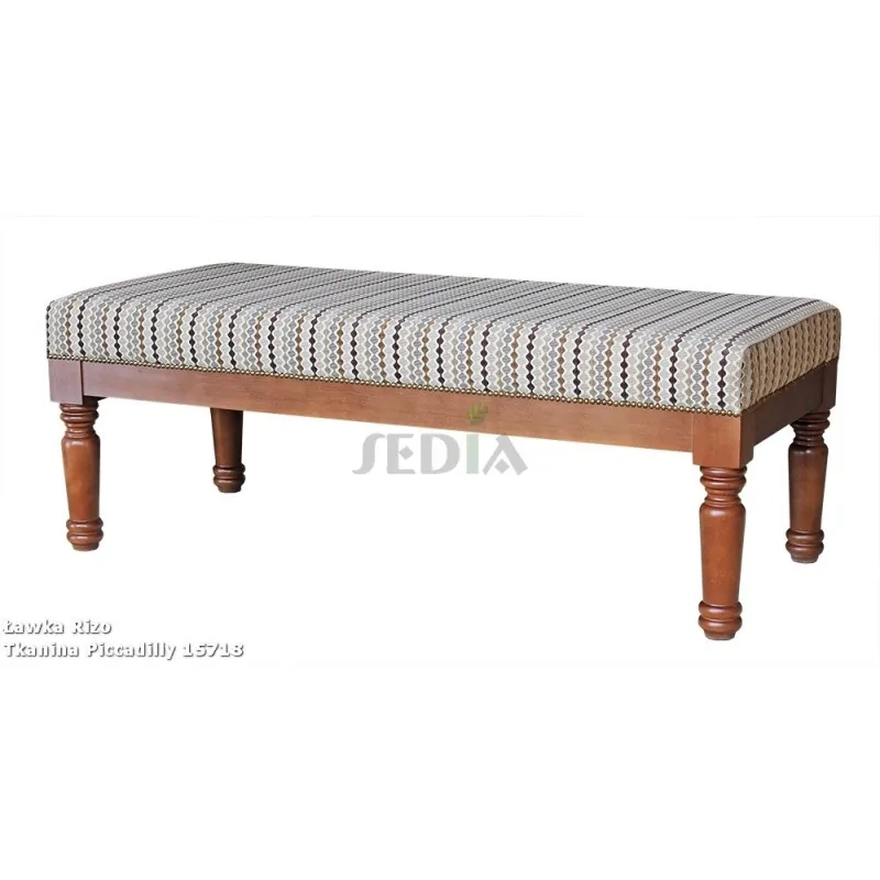 Ławka do jadalni Rizo jest ciekawym i bardzo eleganckim meblem przeznaczonym do jadalni. Zastosowanie w kompozycji pięknie ukształtowanych toczonych nóg z eleganckim wykończeniem powierzchni umożliwia dopasowanie mebla do podobnego stołu i kompletu krzeseł. Kolorystycznie i wzorniczo można również dobrać tkaninę tapicerską tworząc komplet z zestawem stołowym. Ławka do jadalni przyciąga uwagę wyjątkową starannością wykonania i dbałością o szczegóły, dzięki czemu jest meblem bardzo wykwintnym i spełniającym doskonale swoją rolę w stylowych jadalniach urządzanych z myślą o specjalnych okazjach. Długie tapicerowane siedzisko wykonane jest na sprężynach, a dzięki bardzo starannemu połączeniu z drewnianą podstawą – również niezwykle dekoracyjne. Miejsce łączenia wieńczy gęsty szereg główek metalowych nitów, które swoim złotawym kolorem akcentują również elegancki, nawiązujący do przeszłości styl mebla. Siedzisko umieszczone zostało na szerokiej ramie drewnianej podtrzymywanej przez cztery solidne nogi, które z powodzeniem utrzymają ciężar siedzących osób. Ławka do jadalni Rizo nie posiada oparcia, dlatego większy komfort zapewni jej ustawienie pod ścianą. To ciekawy mebel, który sprawdzi się też w innych pomieszczeniach jak np. duży, przestronny przedpokój czy sypialnia.