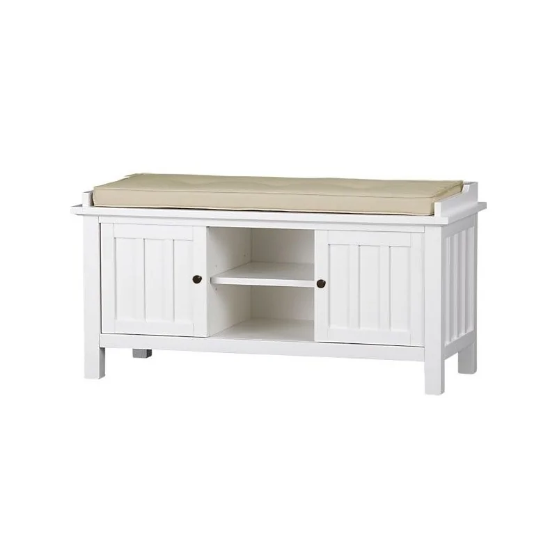 Niebanalna biała ławka drewniana do przedpokoju Moon to kompozycja w bardzo stylowym klimacie przeszłości, idealna do wnętrz retro lub vintage. Mebel wykonany jest w oparciu o bardzo prostą bryłę równoległoboku uzupełniona o cztery belkowate nogi usytuowane pod kątem prostym do podłoża. Nogi stanowią też przedłużenie bocznych krawędzi ramy tworząc jedną całość aż do wysokości blatu. Wnętrze kompozycji wypełniają dwie zewnętrzne szafki oraz umieszczona pomiędzy nimi wnęka podzielona poprzeczka półka. Zarówno wnęka, jak i szafki są wygodnym miejscem do przechowywania obuwia, domowych pantofli lub akcesoriów do pielęgnacji butów. O wyjątkowym uroku modelu, a także o jego niepowtarzalnym stylu decyduje design. Składa się na niego biały kolor lakieru oraz charakterystyczna faktura powierzchni drzwiczek i boków przypominająca naprzemiennie połączone wklęsłe i wypukłe pionowe listwy. Nie można również zapomnieć o funkcjonalnym siedzisku, które stanowi istotę ławki. Tworzy je umieszczona na górnym blacie niewysoka zdejmowana poduszka z gąbki obszyta tkanina tapicerską. Poduszka umieszczona jest pomiędzy listewkami tworzącymi rodzaj chroniącego ją przed zsunięciem korytka. Biała ławka drewniana do przedpokoju Moon to doskonały mebel do przedpokoju, zapewniający miejsce do chwilowego wypoczynku oraz wygodny schowek na obuwie.