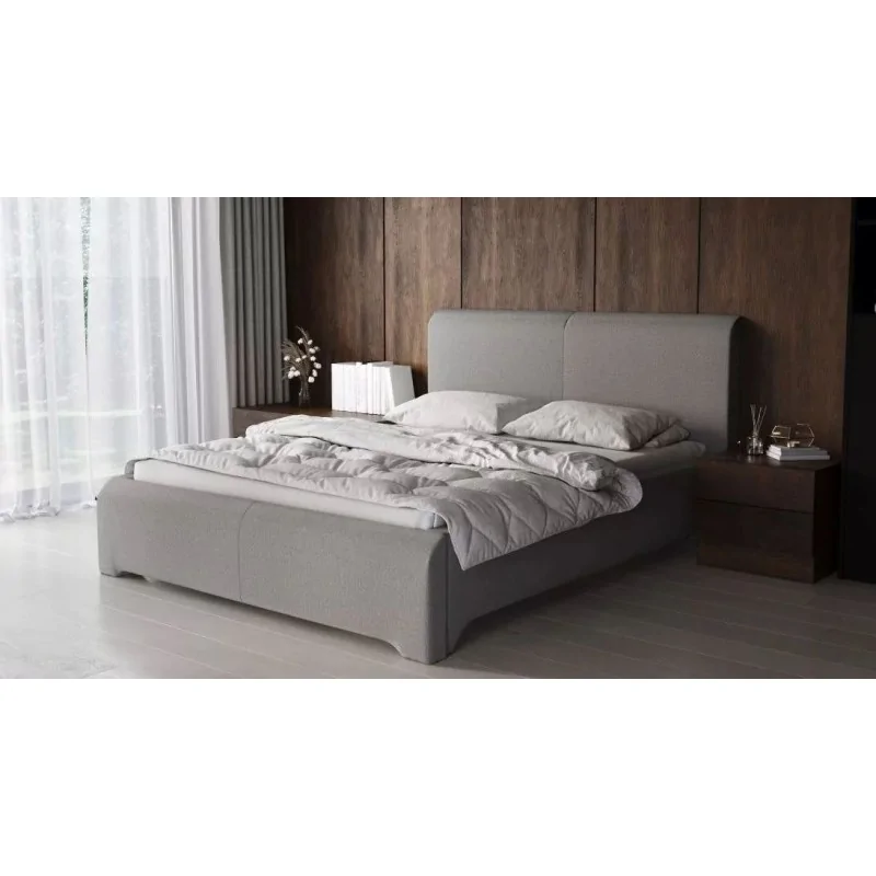 Tapicerowane, podwójne łóżko bez pojemnika Otylia swoją prostotą i zarazem pięknymi kształtami zdominuje każdą sypialnię. Podkreśli ważność snu i zwróci uwagę, że ta przestrzeń ma służyć głównie regeneracji, pomimo tego, że wokół znajdują się takie meble jak toaletka, szafa, biurko, regał z książkami. To idealna propozycja dla tych, którzy nie szukają równowagi, lecz chcą wyznaczyć jasno i pewnie główne przeznaczenie sypialni. Twórcy, mając na uwadze fakt, że wielu domowników przed snem lubi wygodnie się oprzeć i przejrzeć social media lub książkę, postawili na dość grube wezgłowie, które te czynności umili. Rama łóżka, również dość szeroka i wysoka skomponowała się idealnie, pozwalając właścicielom na wybranie najdogodniejszego materaca. Jej boki pełnią funkcję wyprofilowanych nóżek, co jest rzadko spotykane w meblarstwie sypialnianym i dużo opowiada o wysublimowanym guście domowników.