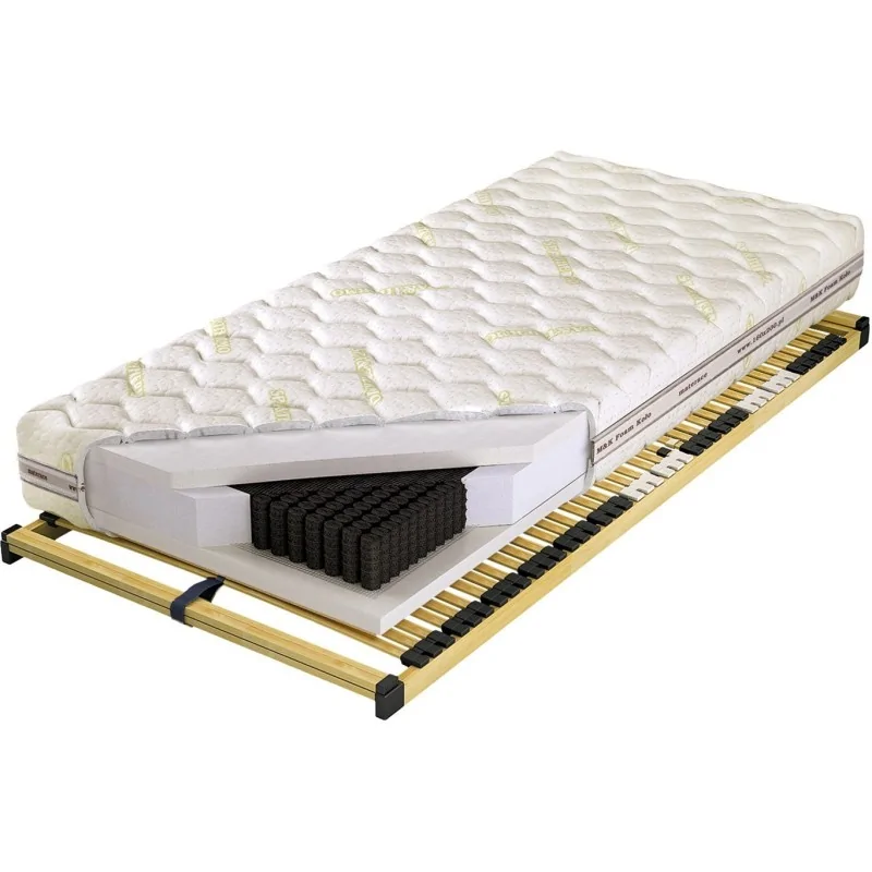 Wkład sprężynowy pokrywa obustronne siatka tapicerska i 3 cm warstwa pianki lateksoidalnej LXI o gęstości ok. 85 kg/m3. Zastosowana pianka zapewni doskonały obieg powietrza i nie pozwoli na rozwój pleśni, roztoczy czy alergenów i zapewnia optymalną cyrkulację powietrza. Idealnie sprawdzi się u osób chorych na astmę bądź u Alergików. Ponadto, dzięki użytym materiałom, każdy centymetr Twojego kręgosłupa będzie podparty punktowo. Materac jest odporny na różnego typu odkształcenia, szybko wraca do pierwotnego wyglądu.