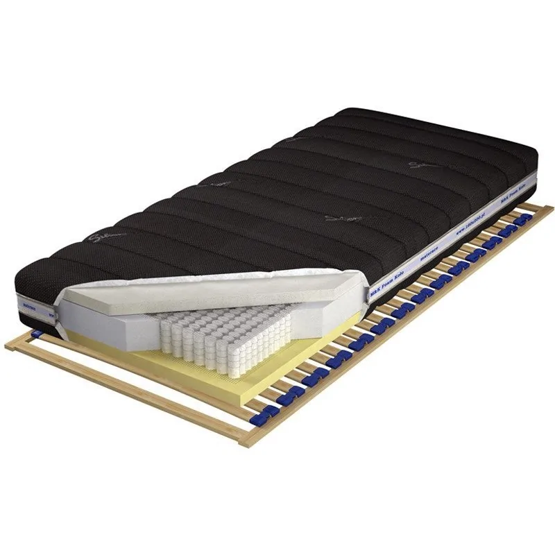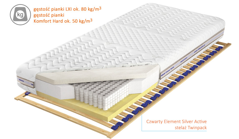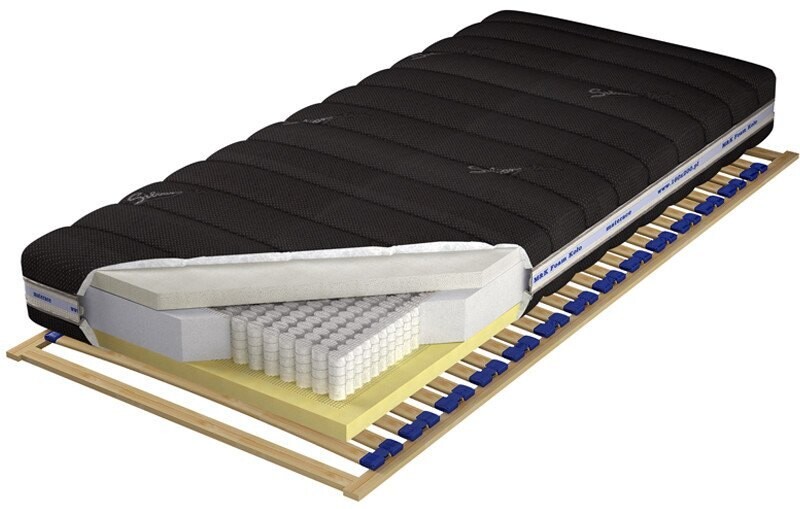 Wkład sprężynowy pokrywa obustronnie siatka tapicerska oraz od góry pianka lateksoidalna o gęstości ok. 80 kg/m3 i wysokości 5 cm, natomiast od dołu znajduje się pianka Komfort Hard o gęstości ok. 50 kg/m3 i wysokości 5 cm. Zastosowana pianka lateksoidalna jest bardzo elastyczna i zapewni doskonały obieg powietrza. Tak świetny system wentylacji nie pozwoli na rozwój pleśni, roztoczy czy alergenów. Idealnie sprawdzi się u osób chorych na astmę bądź u Alergików. Zapewnia optymalną cyrkulację powietrza. Ponadto, dzięki użytym materiałom, każdy centymetr Twojego kręgosłupa będzie podparty punktowo. Materac jest odporny na różnego typu odkształcenia, szybko wraca do pierwotnego wyglądu.