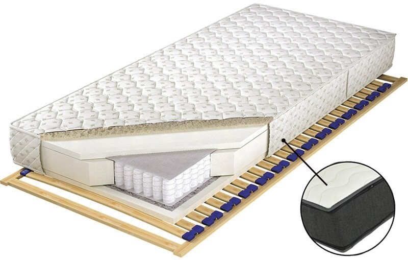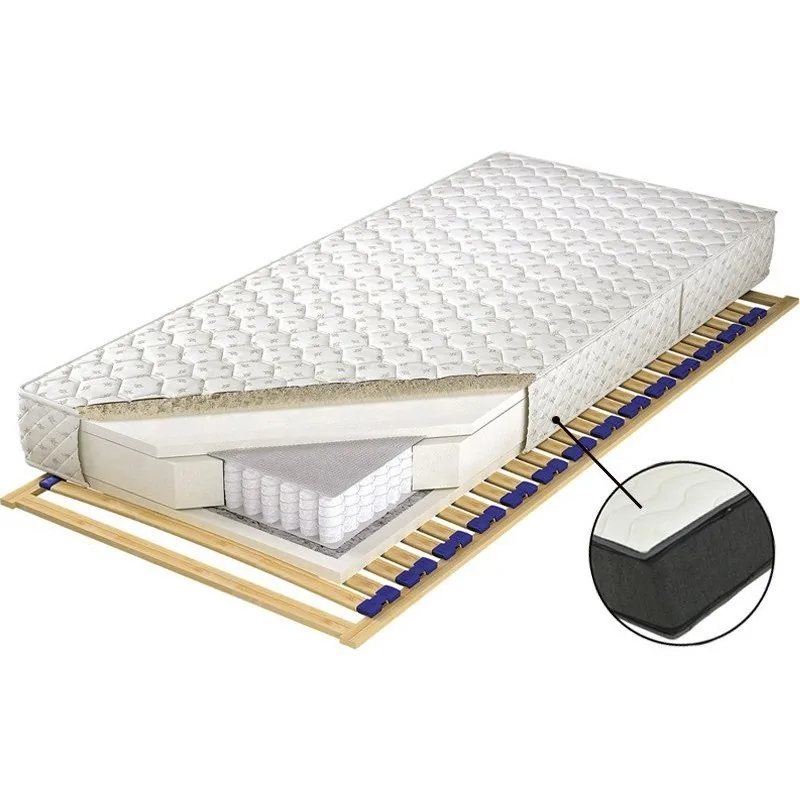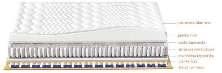 Wkład sprężynowy pokrywa z jednej strony przekładka tapicerska, a z drugiej strony siatka tapicerska i obustronnie pianka poliuretanowa T 35- 30, o zwiększonej sprężystości i gęstości ok. 35 kg/m3 oraz wysokości 3 cm, oraz jednostronnie znajduje się lateksowe włosie końskie. Zastosowana pianka jest bardzo elastyczna i zapewni doskonały obieg powietrza. Tak świetny system wentylacji nie pozwoli na rozwój pleśni, roztoczy czy alergenów. Idealnie sprawdzi się u osób chorych na astmę bądź u Alergików. Zapewnia optymalną cyrkulację powietrza. Końskie włosie stabilizuje całą konstrukcje materaca, długie włókna są mocno ściskane, a to sprawia, że powstaje warstwa odporna na działanie płynów. Ponadto, dzięki użytym materiałom, każdy centymetr Twojego kręgosłupa będzie podparty punktowo. Materac jest odporny na różnego typu odkształcenia, szybko wraca do pierwotnego wyglądu.