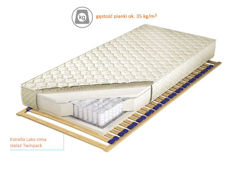 Wkład materaca Estrella stanowią elastyczne sprężyny woreczkowe, produkowane z wysokogatunkowego drutu. Sprężyny znajdują się w osobnych kieszonkach o średnicy 60 mm, klejonych warstwowo flizeliną od góry i od dołu, co zapewnia wsparcie ciała w każdej jego części niezależnie od pozycji, w której śpisz. Taka sekwencja i ich ilość zwiększa i poprawia elastyczność materaca.