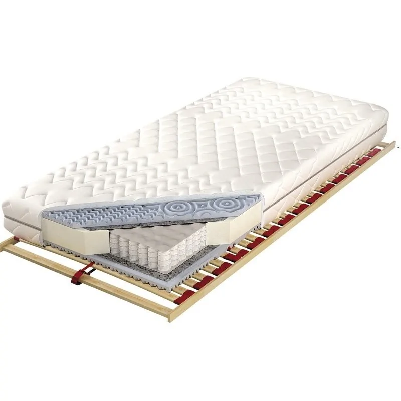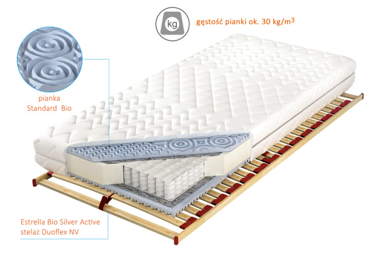 Wkład sprężynowy pokrywa obustronnie przekładka tapicerska oraz modelowana, masująca pianka BIO Standard o wysokości 3 cm i gęstości ok. 30 kg/m3, co poprawia komfort snu i zwiększa elastyczność, a także poprawia ukrwienie ciała. Zastosowana pianka, jest bardzo elastyczna i zapewni doskonały obieg powietrza. Tak świetny system wentylacji nie pozwoli na rozwój pleśni, roztoczy czy alergenów. Idealnie sprawdzi się u osób chorych na astmę bądź u Alergików. Zapewnia optymalną cyrkulację powietrza. Ponadto, dzięki użytym materiałom, każdy centymetr Twojego kręgosłupa będzie podparty punktowo. Materac jest odporny na różnego typu odkształcenia, szybko wraca do pierwotnego wyglądu.