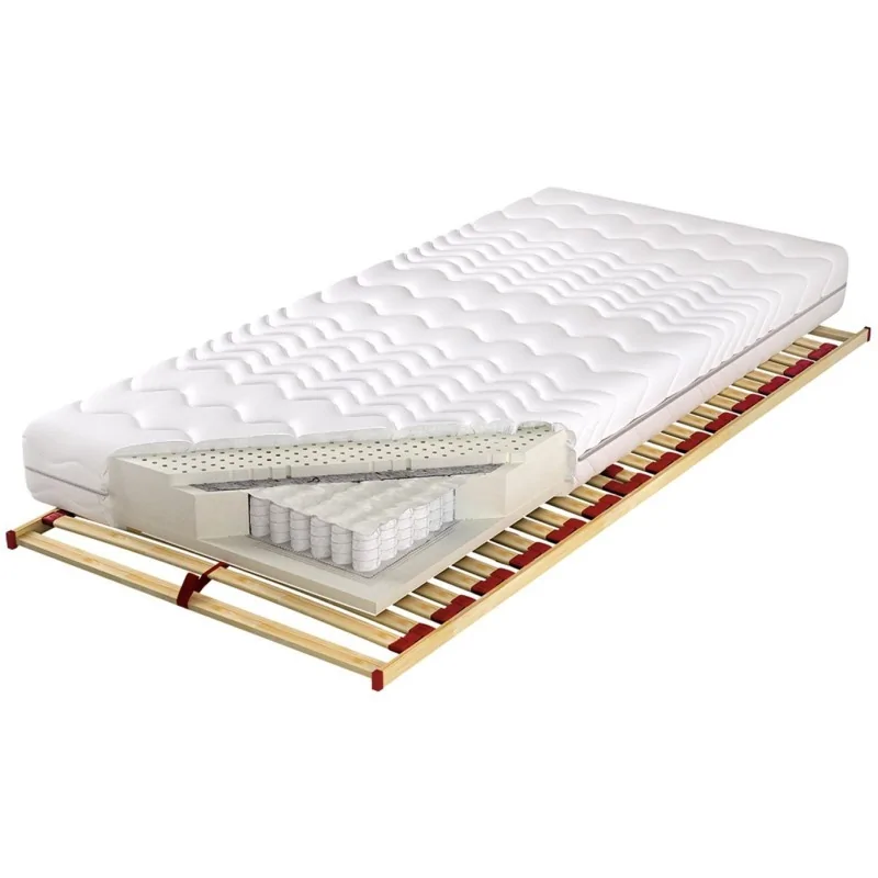 Wkład sprężynowy pokrywa z jednej strony przekładka tapicerska, a z drugiej siatka tapicerska i obustronnie wkład obłożony jest 3 cm warstwą lateksu o gęstości ok. 65 kg/m3. Zastosowany lateks, jest bardzo elastyczny i zapewni doskonały obieg powietrza. Tak świetny system wentylacji nie pozwoli na rozwój pleśni, roztoczy czy alergenów. Idealnie sprawdzi się u osób chorych na astmę bądź u Alergików. Zapewnia optymalną cyrkulację powietrza. Ponadto, dzięki użytym materiałom, każdy centymetr Twojego kręgosłupa będzie podparty punktowo. Materac jest odporny na różnego typu odkształcenia, szybko wraca do pierwotnego wyglądu.