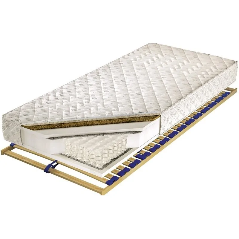 Wkład sprężynowy pokrywa obustronnie przekładka tapicerska oraz pianka poliuretanowa T - 25 o wysokości 1,5 cm i gęstości ok. 25 kg/m3 oraz lateksowana płyta kokosowa. Zastosowana pianka jest bardzo sprężysta i zapewni doskonały obieg powietrza. Tak świetny system wentylacji nie pozwoli na rozwój pleśni, roztoczy czy alergenów. Idealnie sprawdzi się u osób chorych na astmę bądź u Alergików. Zapewnia optymalną cyrkulację powietrza. Ponadto, dzięki użytym materiałom, każdy centymetr Twojego kręgosłupa będzie podparty punktowo. Lateksowana płyta kokosowa sprawia, że materac jest bardziej elastyczny, dlatego może być zginany bez ryzyka przełamania. Materac jest odporny na różnego typu odkształcenia, szybko wraca do pierwotnego wyglądu.