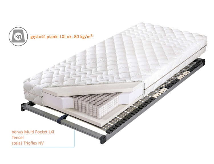 Wkład materaca Venus Multi Pocket LXI x5 stanowią bardzo elastyczne siedmiopolowe sprężyny woreczkowe 1000S, produkowane z wysokogatunkowego drutu. Sprężyny znajdują się w osobnych kieszonkach o średnicy 38 mm, klejonych punktowo, co zapewnia wsparcie ciała w każdej jego części niezależnie od pozycji, w której śpisz. Taka sekwencja i ich ilość zwiększa i poprawia elastyczność materaca. Występują tutaj dwa rodzaje sprężyn H2 - bardziej miękka, oraz H3 - twardsza, o większej średnicy drutu.
