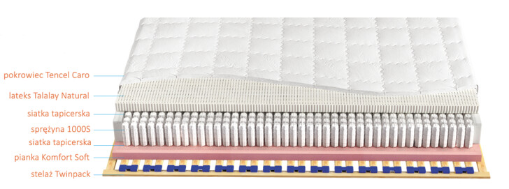 Wkład sprężynowy pokrywa obustronnie siatka tapicerska oraz z jednej strony 3,5 cm warstwa 100 % naturalnego lateksu Talalay o gęstości w twardości H2 - ok. 83 kg/m3 a w twardości H3 - 99 kg/m3, z drugiej strony wkład pokrywa warstwa pianki Komfort Soft o wysokości 3 cm i gęstości ok. 50 kg/m3. Zastosowany lateks jest bardzo sprężysty i zapewni doskonały obieg powietrza, za sprawą 99,9 % otwartych komórek. Tak świetny system wentylacji nie pozwoli na rozwój pleśni, roztoczy czy alergenów. Idealnie sprawdzi się u osób chorych na astmę bądź u Alergików. Zapewnia optymalną cyrkulację powietrza. Ponadto, dzięki użytym materiałom, każdy centymetr Twojego kręgosłupa będzie podparty punktowo. Materac jest odporny na różnego typu odkształcenia, szybko wraca do pierwotnego wyglądu.