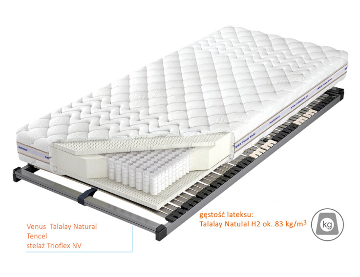 Wkład sprężynowy pokrywa obustronnie siatka tapicerska oraz 3,5 cm warstwa lateksu Talalay Natural 100 % o gęstości ok. 83 kg/m3. Zastosowany lateks jest bardzo sprężysty i zapewni doskonały obieg powietrza, za sprawą 99,9 % otwartych komórek. Tak świetny system wentylacji nie pozwoli na rozwój pleśni, roztoczy czy alergenów. Idealnie sprawdzi się u osób chorych na astmę bądź u Alergików. Zapewnia optymalną cyrkulację powietrza. Ponadto, dzięki użytym materiałom, każdy centymetr Twojego kręgosłupa będzie podparty punktowo. Materac jest odporny na różnego typu odkształcenia, szybko wraca do pierwotnego wyglądu.