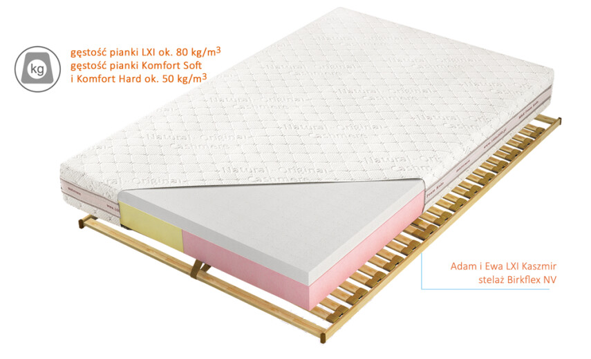 Wkład materaca Adam i Ewa LXI stanowią warstwy pianek Komfort oraz warstwa pianki lateksoidalnej LXI. W materacu występują 2 warianty twardości - H2 - bardziej miękka, oraz H3 - bardziej twarda.