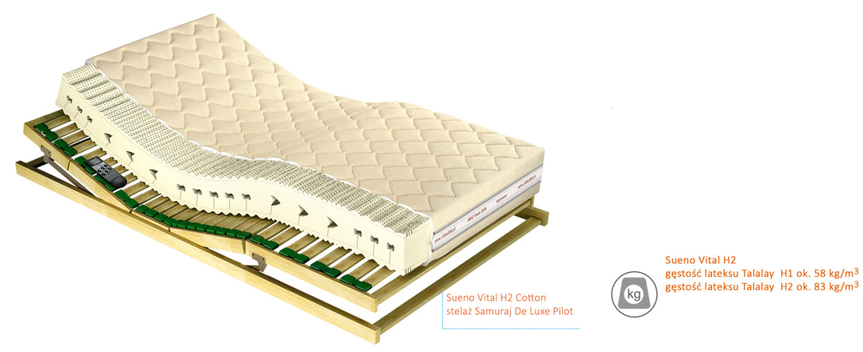 Wkład materaca Sueno Vital stanowi 100% naturalny lateks o siedmiu zróżnicowanych strefach twardości. Serce materaca stanowi 14 cm lateks, który jest wycinany konturowo o twardości H2 i gęstości ok. 83 kg/m3. Lateks obłożony jest obustronnie bardziej sprężystym lateksem naturalnym o twardości H1, który ma gęstości ok. 58 kg/m3. Lateks charakteryzuje się świetnym obiegiem powietrza, za sprawą 99,9 % otwartych komórek, co nie pozwoli na zagnieżdżenie w nim drobnoustrojów i zapewni higieniczny, zdrowy sen. Wkład materaca, niesie za sobą regeneracje i wypoczynek. Ponadto, dzięki użytym materiałom, Twoje ciało zostanie odpowiednio zregenerowane i da wytchnienie zmęczonym mięśniom.
