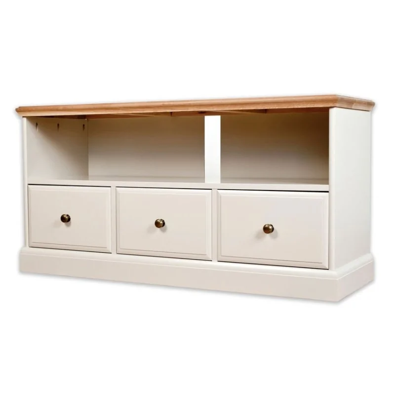 Biała szafka pod telewizor Arte jest niestandardową kompozycją, w której zastosowano ciekawy układ wnętrza z podziałem na wyżej położoną wnękę i trzy niżej usytuowane szuflady. Poza sposobem zagospodarowania wnętrza ciekawe i zarazem nietypowe są proporcje, bowiem zarówno szuflady, jak i wnęka wyróżniają się sporą jak na tego rodzaju mebel wysokością. Wnęka pod blatem stanowi jedną całość, pozwalając na wygodne umieszczenie w niej nawet dużego urządzenia, jednak w celu urozmaicenia kompozycji na wysokości pomiędzy drugą i trzecią szufladą umieszczono pionową listwę. Dużym udogodnieniem są też trzy niewielkie otwory wykonane w bocznej ścianie, pozwalające na wygodne przełożenie kabli antenowych i elektrycznych. Wysokie szuflady zapewniają też wiele miejsca na kolekcję płyt z filmami czy muzyką, oraz różne akcesoria do kina domowego. Całość usytuowana na szerokiej, masywnej podstawie tworzy wrażenie wyjątkowej stabilności a solidny dół dodaje też modelowi optycznego ciężaru. Dopełnienie całości stanowi wyjątkowo efektowny, przestronny blat z drewna dębowego, idealny zarówno pod telewizor, jak i do ustawienia dekoracji. Biała szafka pod telewizor Arte to piękny mebel do stylowych wnętrz, który podkreśli wystrój retro i doda mu wiele uroku.