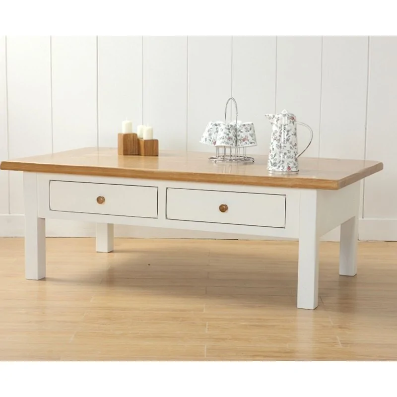Stolik z drewnianym blatem Lorenzo to piękny, stylowy mebel przeznaczony do salonów aranżowanych w klimacie vintage, skandynawskim lub prowansalskim. Charakterystyczne połączenie w jednej kompozycji białej barwy z kolorem naturalnego drewna, z którego wykonano blat jest typowym elementem stylizacji sprzed wieku. Stolik zaprojektowano w oparciu o proste, geometryczne kształty, których nie zakłóca nawet wykończenie krawędzi blatu ograniczone do prostego ścięcia z delikatnie zaokrąglonymi krawędziami. W kompozycji zaznacza się wyjątkowa harmonia i uporządkowanie podkreślone równoległymi i prostopadłymi liniami połączeń oraz czworokątnymi przekrojami elementów. W kompozycji wyróżnia się szeroka rama, w którą wbudowano dwie szuflady o sporej pojemności, zapewniające schowek na podręczne akcesoria. Fronty szuflad zostały wpuszczone w ramę tak, że tworzą wraz z nią jednolitą, gładką powierzchnię, co dodatkowo wzmacnia efekt geometrycznego uporządkowania. Akcentują je również proste, belkowate nogi utrzymujące blat. Pomimo pewnego schematyzmu właśnie dzięki swojej prostocie stolik jest bardzo piękny i pełen wdzięku. To mebel posiadający urok dziecięcych zabawek, genialnych w swojej prostocie i zrazem wyjątkowo pięknych. Stolik z drewnianym blatem Lorenzo jest doskonałym elementem stylowego kącika wypoczynkowego w salonie.