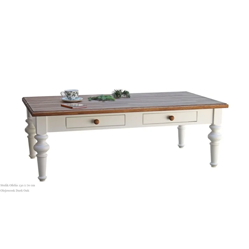 Bardzo charakterystyczny, przesycony klimatem dawnych wnętrz stolik kawowy w stylu francuskim Ofelia jest meblem, który przywołuje wspomnienia z przeszłości i pozwala delektować się niezaprzeczalnym pięknem. Styl retro modelu definiuje charakterystyczne połączenie neutralnej bieli z drewnianym blatem, który wyraźnie akcentuje związek z przyroda i wykorzystanie naturalnych materiałów. To stylizacja typowa dla wzornictwa sprzed wieku i wiejskich domów południowej Francji. W modelu wyróżnia się bardzo specyficzne zestawienie funkcji praktycznej, użytkowej z walorami ozdobnymi, dzięki którym z pewnością każde wnętrze zyska na atrakcyjności i niezaprzeczalnym uroku. Stolik kawowy w stylu francuskim Ofelia jest niewysoki, dzięki czemu sprawia wrażenie jeszcze większego i przestronniejszego doskonale wypełniając nawet bardzo przestronną strefę wypoczynkową. To mebel, który pięknie dopasuje się do francuskiej sofy i tapicerowanych foteli zapewniając podręczne miejsce na filiżankę kawy czy przeglądane czasopismo. Elementem dodającym stolikowi atrakcyjności są masywne toczone nogi, które sprawiają wrażenie bardzo solidnych, a jednocześnie pełnych wdzięku dzięki szczupłym zakończeniom tuż przy podłodze. Do walorów praktycznych z pewnością zaliczają się dwie wbudowane pod blat szuflady przeznaczone do przechowywania podręcznych drobiazgów.