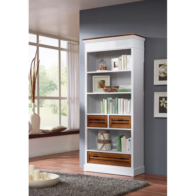 Piękna, stylowa biblioteczka na wymiar Epos to mebel, który spełni oczekiwania najbardziej wybrednych osób. Wyróżniając się niebanalnym designem oraz przyciągającym uwagę, kontrastowym połączeniem bieli i naturalnego drewna w ciemnym odcieniu, wygląda niezwykle efektownie. Mebel o optymalnych proporcjach, z możliwością zamówienia w najbardziej odpowiednim do wnętrza wymiarze to wysoki komfort, pozwalający na idealne dopasowanie do wolnego miejsca w pokoju. Biblioteczka to kompozycja otwarta, gwarantująca wygodny dostęp do zawartości półek i ułatwiająca tworzenie pięknych ekspozycji bibelotów czy kolekcji książek. Model wyposażony jest w jedną dużą i dwie mniejsze szuflady z drewna z ciekawymi, ażurowymi frontami. Kontrastowy dodatek to sposób na ożywienie wystroju wnętrza i zaakcentowanie jego przyjemnego domowego klimatu, jaki wprowadza ciepły odcień i faktura drewna. Biblioteczka posiada cztery przestronne półki - idealne do układania nawet sporej wielkości przedmiotów. To mebel nie tylko stylowy i piękny, ale też bardzo komfortowy, zapewniający wiele miejsca na domowe drobiazgi.