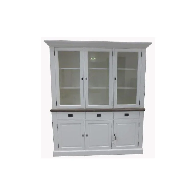 Tobiasz to piękny kredens pokojowy, którego atutem jest prosta, niewyszukana forma, będąca doskonałym dopełnieniem wielu różnych stylizacji wnętrz. Mebel nosi w sobie cechy stylu retro, nawiązując detalami zdobniczymi i formą do klimatu dawnej Prowansji, a także do prostoty stylu skandynawskiego. To harmonijna kompozycja, w której wyraźnie zaznaczają się trzy kolumny oraz podział poziomy na górną, przeszkloną szafkę i zabudowany dół. Potrójne szafki to nie tylko więcej miejsca na różne przedmioty czy dekoracje, ale również większa powierzchnia kredensu, który dzięki temu świetnie zaprezentuje się w dużym pokoju. Dolna część, wyposażona w podwójną i pojedynczą szafkę, została zwieńczona naturalnym drewnianym blatem, który dodatkowo podkreśla podział na dwie odmienne części. Zaletą drewnianego blatu jest stylistyczne nawiązanie do prostych wnętrz retro, tworzące ciepły, rodzinny klimat domu. Przeszklona witryna pozwala na zaprezentowanie w pełnej krasie kolekcji miniatur, bibelotów czy stylowych dekoracji, które wzmocnią stylowy klimat wnętrza.