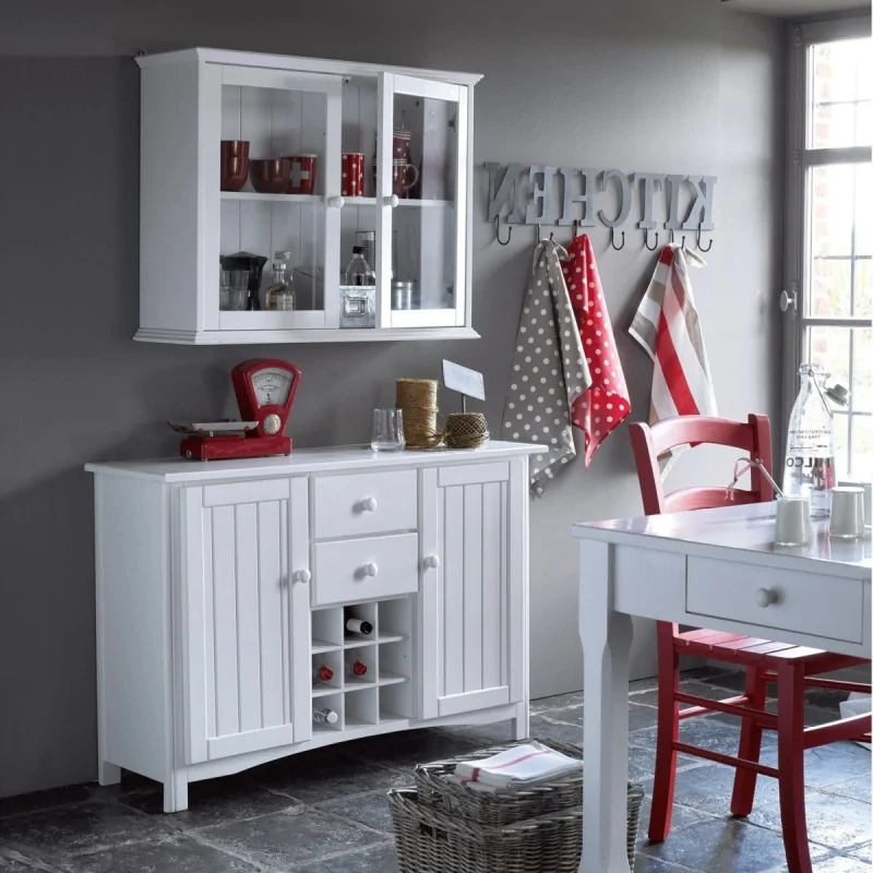 Komoda biała vintage Lozanna to mebel, który zachwyca swoim pięknem, niebanalnością i wyszukanym stylem. W kompozycji mebla można odnaleźć zarówno cechy skandynawskie, jak i prowansalskie składające się na ogólną, ciekawą formę o wyjątkowej elegancji i walorach dekoracyjnych. Komoda jest niewysokim, zgrabnym meblem, który idealnie zaprezentuje się w wystroju wnętrza nie dominując w nim, lecz tworząc efektowny, przyciągający uwagę dodatek. Atutem mebla jest nie tylko piękny biały design, ale również urozmaicona organizacja wnętrza. To połączenie dwóch zewnętrznych, jednodrzwiowych szafek z nieco węższą częścią środkową, w której znajdują się dwie wysokie szufladki i dolna kratownica do przechowywania butelek wina lub innych drobiazgów. Dzięki niedużej głębokości mebel doskonale sprawdzi się w mniejszych pokojach, zajmując niewiele miejsca pod ścianą. Wąski, ale przestronny blat to dodatkowe miejsce na ciekawą ekspozycję zdjęcia rodzinnego, stojący zegar lub lampę. Niewielkie nóżki sprawiają, że komoda jest lekka wizualnie, dodając wnętrzu elegancji i wdzięku.