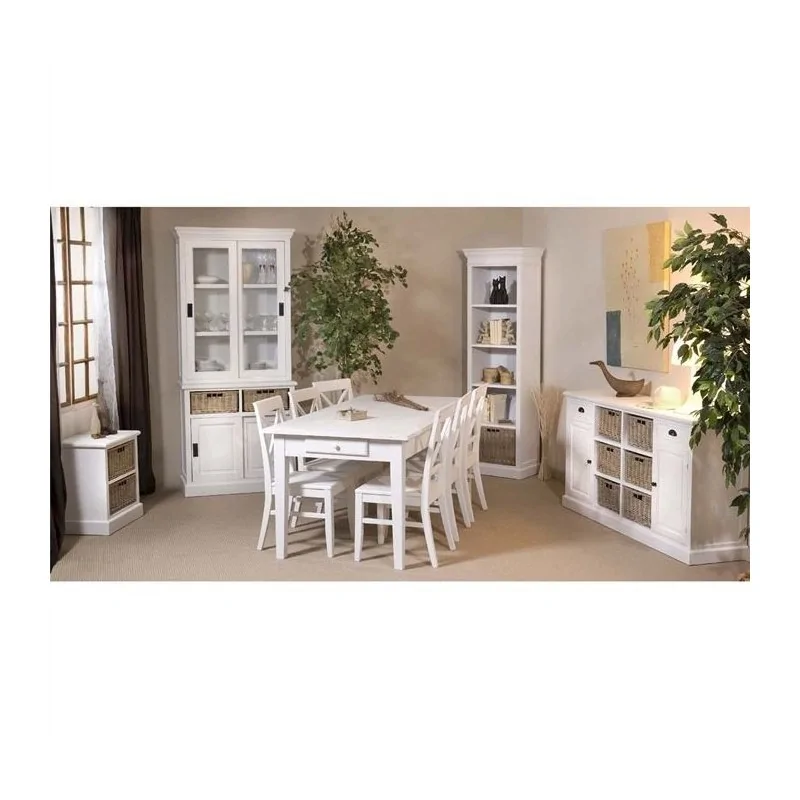 Stylowa komoda biała Solena to niezaprzeczalne piękno i wyjątkowy klimat stylu prowansalskiego ukryty w prostej formie i charakterystycznych dekoracjach oraz w naturalnym dodatku w postaci wiklinowych koszy. Mebel w białym kolorze tworzy ciekawy kontrast z naturalnym odcieniem wikliny tym samym podkreślając związek z naturą, typowy dla wzornictwa sprzed wieku. Komoda wykonana z litego drewna i płyty MDF jest wyjątkowo trwała i zachowa niezmieniony wygląd przez wiele lat, a dzięki przemyślanej organizacji wnętrza jest też bardzo funkcjonalna i pozwala na wygodne przechowywanie nawet drobnych rzeczy. Wnętrze komody to dwie zewnętrzne szafki z pełnymi drzwiczkami oraz umieszczone nad nimi niewielkie szuflady, idealne na drobne przedmioty. Centralną część mebla zajmuje sześć wnęk ułożonych w dwie kolumny i wypełnionych wiklinowymi koszami. Zastępujące szuflady koszyki są bardzo pojemne i wygodne, bowiem bez problem można je wyjąć i przenieść w miejsce wymagające wykorzystania ich zawartości. Stylowa komoda biała Solena to bardzo stylowy, ciekawy i przyjemny wizualnie mebel, który w wyraźny sposób zaakcentuje ciepły klimat wnętrza.