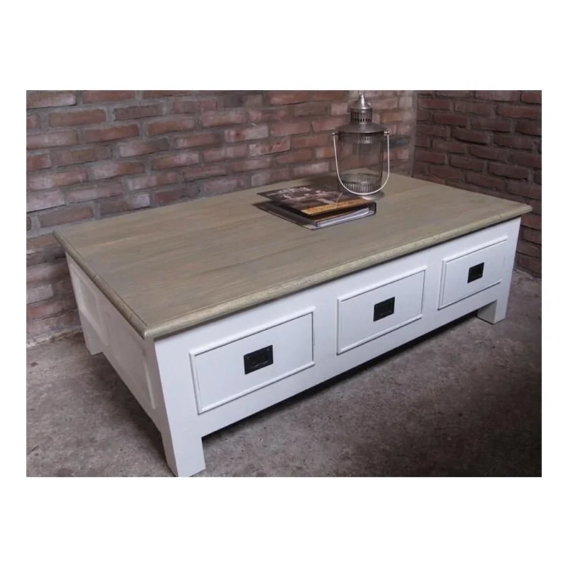Stolik drewniany biały Arkadiusz to mebel, kryjący w sobie prawdziwą naturę Prowansji, w której czas zatrzymał się na początku ubiegłego wieku, zachowując dla współczesności ten klimat rodzinnych, przesyconych miłością domów oraz bliskości natury wyrażonej wszechobecną wikliną i surowym drewnem. Drewniany blat jest dodatkiem do niskiego, przestronnego stolika, swoim wyglądem przypominającego nieco szafkę na czworokątnych nogach. To ciekawe wrażenie tworzy masywna, wysoka rama pod blatem wypełniona trzema szufladami, która wraz z przykrywającą ją płytą surowego drewna zajmuje prawie całą wysokość stolika. Miano stolika mebel zyskuje dzięki wspomnianym niewysokim, ale masywnym nogom. Cała kompozycja tworzy wrażenie bardzo solidnej i stabilnej, a dzięki trzem pojemnym szufladom jest też praktyczna, zapewniając miejsce na sporo domowych drobiazgów. Atutem jest duża powierzchnia blatu, która nie tylko zapewni kilku osobom miejsce na filiżankę czy talerzyk, ale też pozwoli na umieszczenie stałej dekoracji w postaci serwetki czy wazonika. Stolik drewniany biały Arkadiusz, dzięki swoim rozmiarom, pięknie wypełni przestrzeń kącika relaksu.