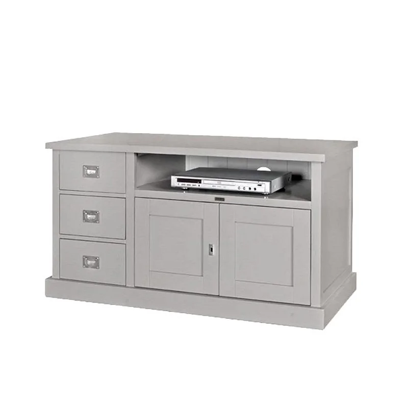 Szara szafka rtv Berta to piękny mebel, którego design inspirowany jest dawnym wzornictwem skandynawskim i prowansalskim, stawiając ten model w kategorii prostych, ale eleganckich sprzętów w klimacie retro. Szafka wyróżnia się prostą konstrukcją, której formę oparto na bryle sześcianu urozmaiconej nieco wysuniętym, lekkim blatem i trochę masywniejszą podstawą. Dzięki tej prostocie mebel doskonale wkomponuje się w aranżację retro, vintage i nowoczesną. Szary kolor jest subtelnym nawiązaniem do tradycyjnego wzornictwa pozostającego w bliskim związku z naturą. To również kolor uniwersalny, pasujący zarówno do wnętrz o podobnym wystroju, jak i do stylizacji kolorowych. Wnętrze szafki wyposażone jest trzy ułożone kolumnowo szuflady o sporej pojemności, dużą dwudrzwiową szafkę i umieszczoną nad nią przestronną niszę na odtwarzacz DVD lub inny element zestawu elektronicznego. Szara szafka rtv Berta nie należy do mebli masywnych, a pomimo zabudowania wnętrz zachowuje pewną delikatność i wdzięk. Niski blat pod telewizor doskonale komponuje się z kompletem wypoczynkowych, zapewniając odpowiedni poziom ustawienia ekranu.