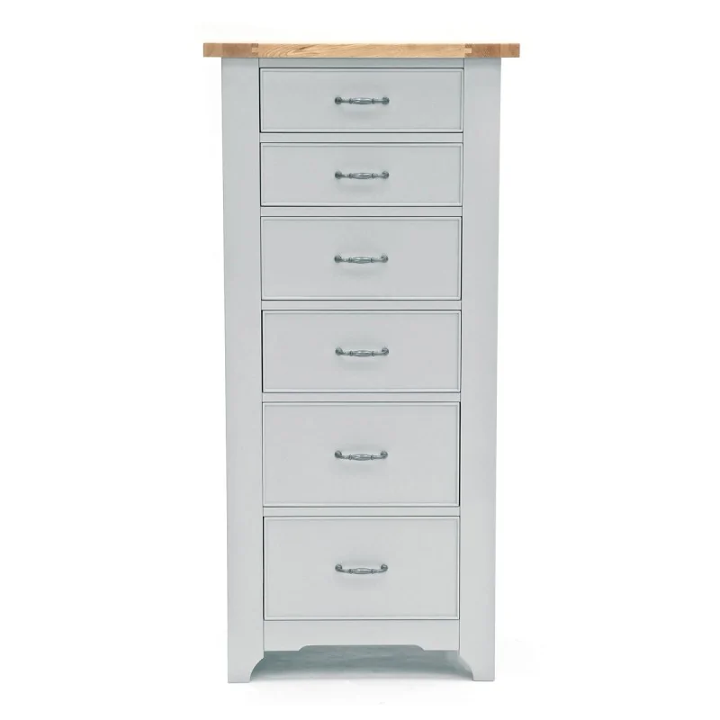 Komoda biała prowansalska Alicja jest meblem, który w wyjątkowo przemyślany sposób zaspokaja potrzebę uporządkowanego przechowywania domowych drobiazgów. Mebel o niewielkim przekroju doskonale sprawdzi się w małych pomieszczeniach, zajmując niewiele miejsca, a jednocześnie zapewniając dużą ilość pojemnych schowków. Prowansalski styl w komodzie definiuje zarówno jej biały kolor, jak i charakterystyczny dodatek, którym jest blat z surowego drewna. Wnętrze mebla wypełnia aż sześć szuflad niejednakowej pojemności, ułożonych po dwie od największych na dole, po najpłytsze u góry. Dzięki takiej organizacji możliwy jest bardzo wygodny podział przechowywanych rzeczy – większych i cięższych w dolnych szufladach, a drobiazgów w najwyżej położonych. Komoda biała prowansalska Alicja jest ustawiona na podstawie z wyprofilowanymi nóżkami, dlatego wydaje się jeszcze wyższa i szczuplejsza, doskonale prezentując się w lekkich prowansalskich aranżacjach. Mebel świetnie sprawdzi się zarówno w sypialni, jak i w jadalni czy pokoju dziecinnym - jako miejsce na bieliznę, środki pielęgnacji lub zabawki.