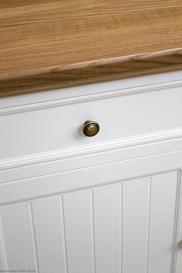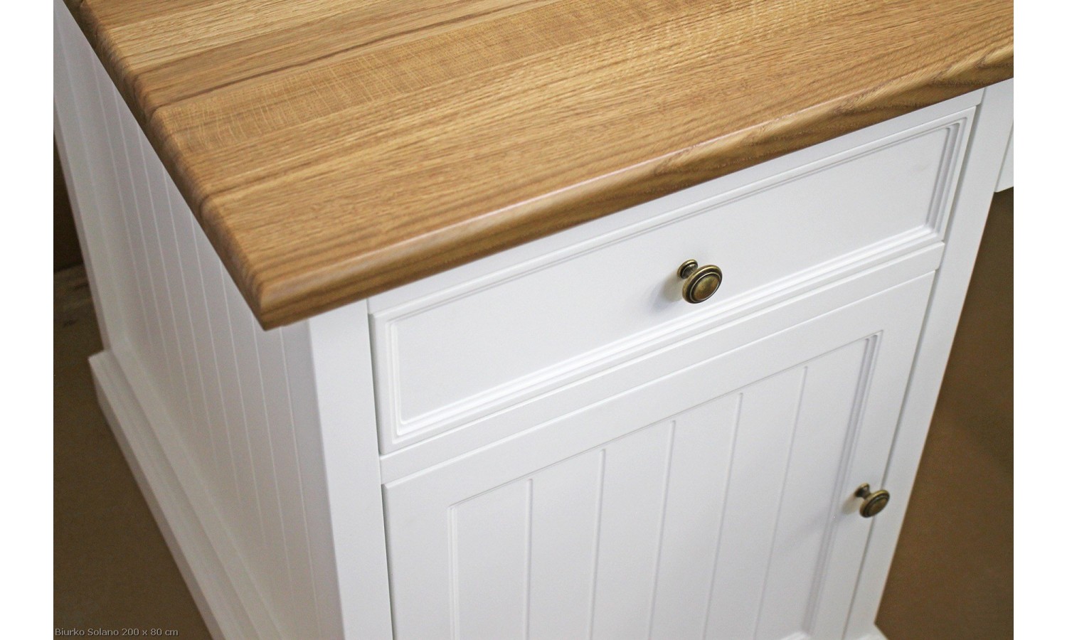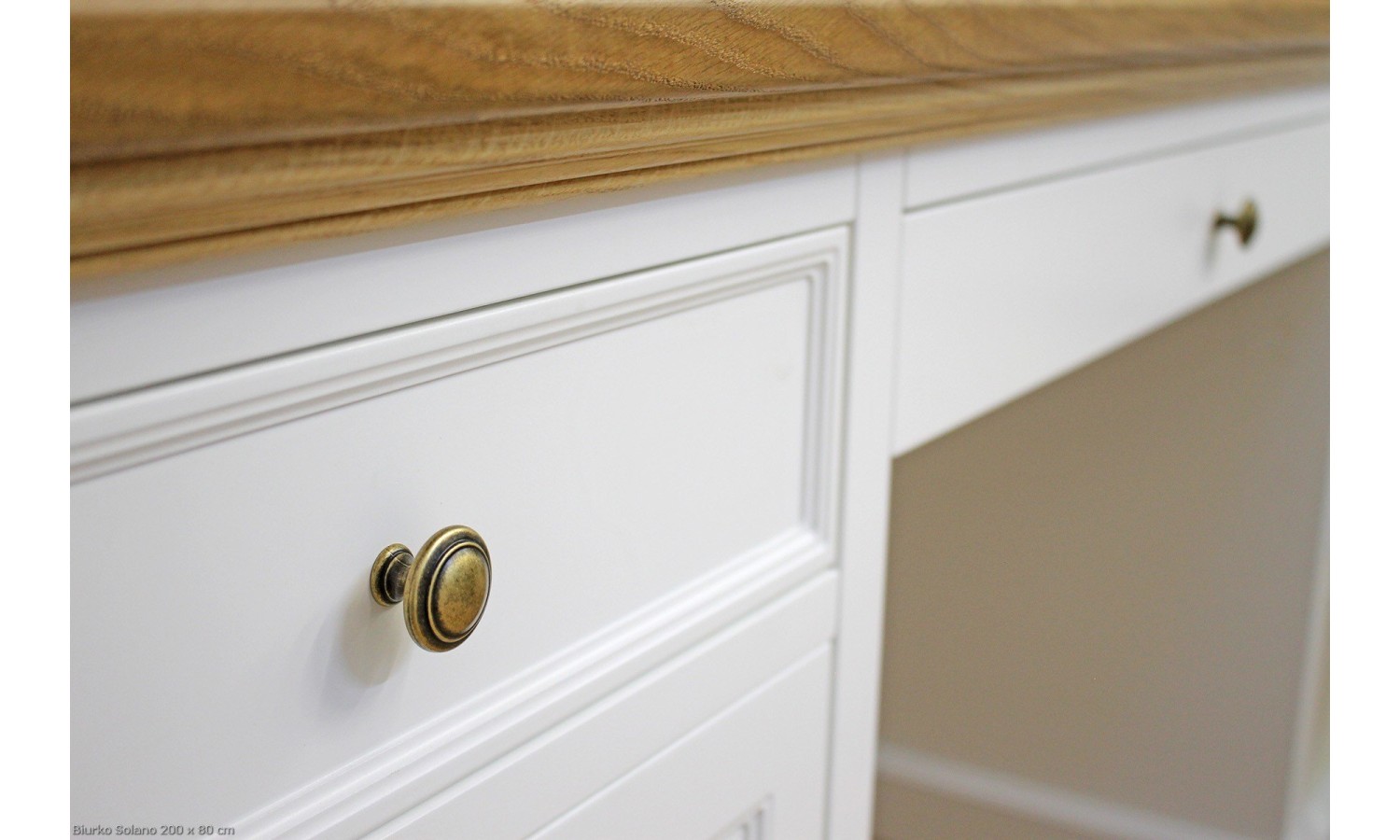 Białe biurko gabinetowe Solano jest kompozycją w stylu rustykalnym, noszącą w sobie znamiona mebli skandynawskich i prowansalskich. W dekoracji biurka wyróżnia się przede wszystkim charakterystyczny pionowy relief, który sugeruje konstrukcję z desek. Nawiązaniem do tego szlachetnego materiału jest też niebarwiony blat, typowy dla mebli prowansalskich i rustykalnych. Blat pięknie komponuje się z bielą mebla, stanowiąc przeciwwagę kompozycyjną dla masywnej podstawy. Konstrukcja biurka składa z dwóch zewnętrznych szafek połączonych ze sobą powierzchnią blatu. Szafki nie są zagospodarowane jednakowo, bowiem lewą stronę wypełnia spora szafeczka z szufladą, a w prawej umieszczono trzy szuflady o różnej pojemności. Dodatkowa szuflada znajduje się również pod blatem, w przestrzeni pomiędzy szafkami. Spora ilość schowków w biurku to sposób na ekonomiczne wykorzystanie miejsca oraz możliwość przechowywania wielu przydatnych materiałów. Pomimo rozbudowanej konstrukcji mebel nie tworzy wrażenia masywnego, co zawdzięcza pionowym rowkom i masywniejszym podstawom, które dodają lekkości całej bryle. To piękny dodatek do stylowego gabinetu