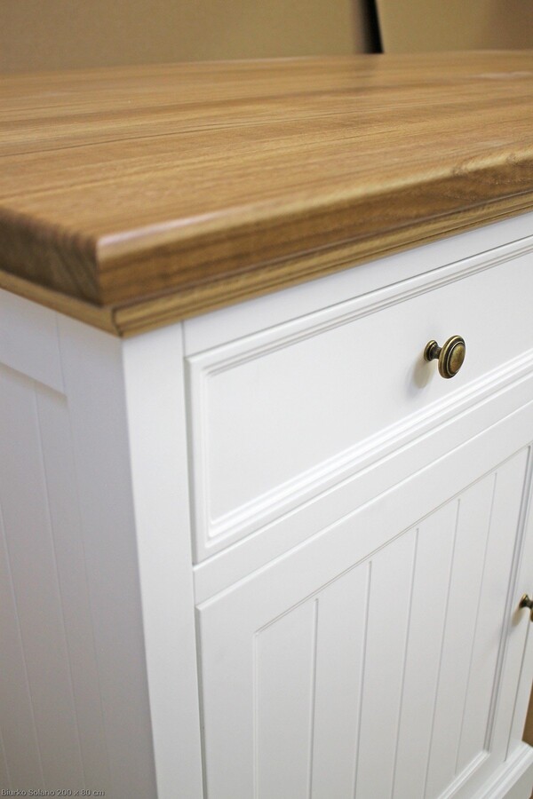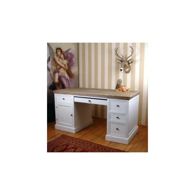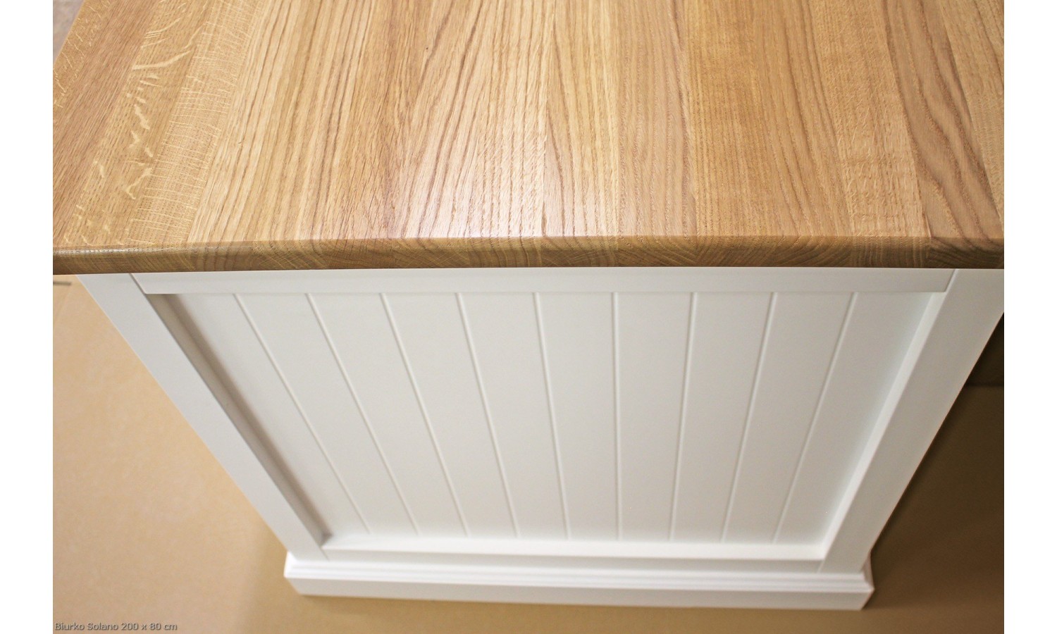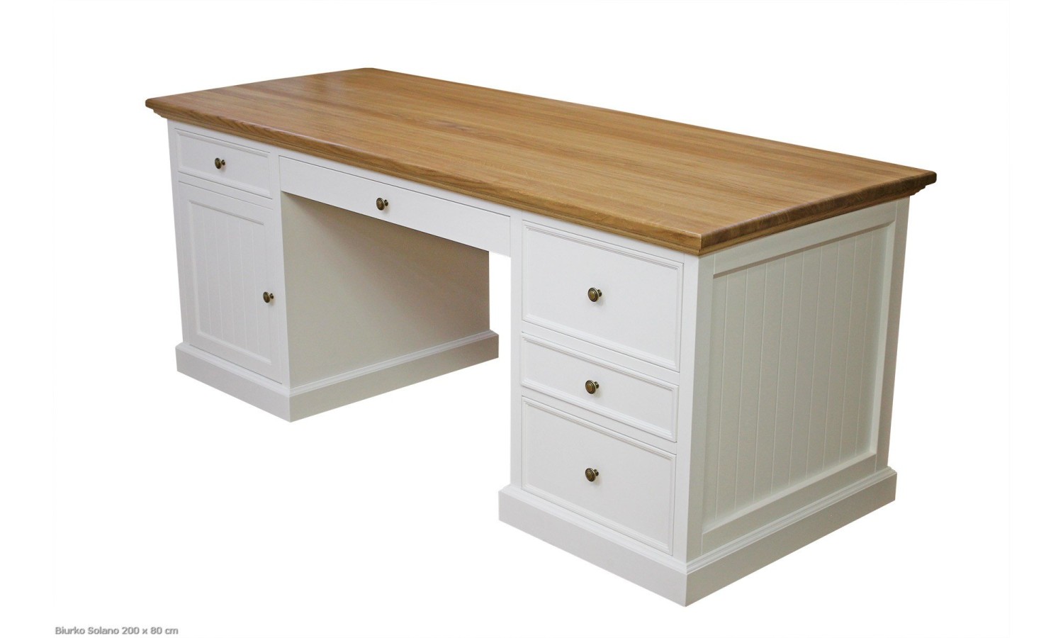 Białe biurko gabinetowe Solano jest kompozycją w stylu rustykalnym, noszącą w sobie znamiona mebli skandynawskich i prowansalskich. W dekoracji biurka wyróżnia się przede wszystkim charakterystyczny pionowy relief, który sugeruje konstrukcję z desek. Nawiązaniem do tego szlachetnego materiału jest też niebarwiony blat, typowy dla mebli prowansalskich i rustykalnych. Blat pięknie komponuje się z bielą mebla, stanowiąc przeciwwagę kompozycyjną dla masywnej podstawy. Konstrukcja biurka składa z dwóch zewnętrznych szafek połączonych ze sobą powierzchnią blatu. Szafki nie są zagospodarowane jednakowo, bowiem lewą stronę wypełnia spora szafeczka z szufladą, a w prawej umieszczono trzy szuflady o różnej pojemności. Dodatkowa szuflada znajduje się również pod blatem, w przestrzeni pomiędzy szafkami. Spora ilość schowków w biurku to sposób na ekonomiczne wykorzystanie miejsca oraz możliwość przechowywania wielu przydatnych materiałów. Pomimo rozbudowanej konstrukcji mebel nie tworzy wrażenia masywnego, co zawdzięcza pionowym rowkom i masywniejszym podstawom, które dodają lekkości całej bryle. To piękny dodatek do stylowego gabinetu