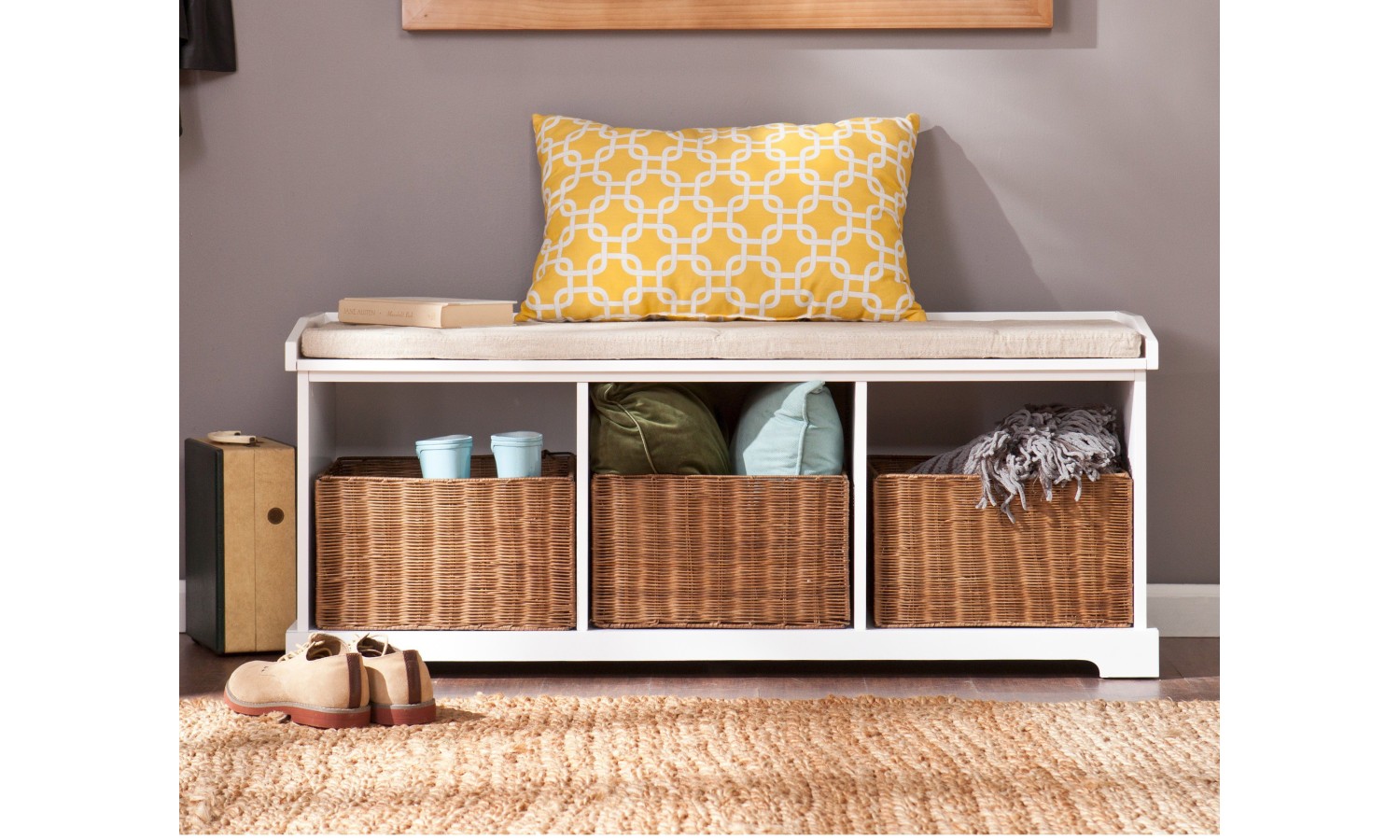 - W zestawie do ławki trzy koszyki w kolorze naturalnej wikliny.