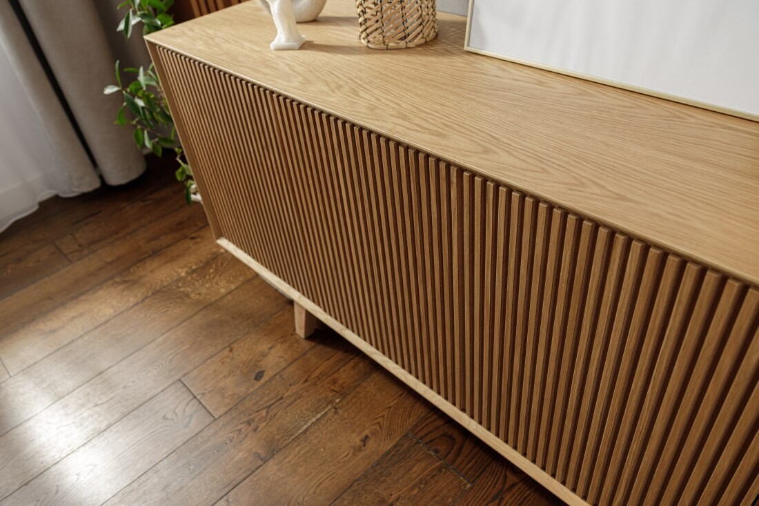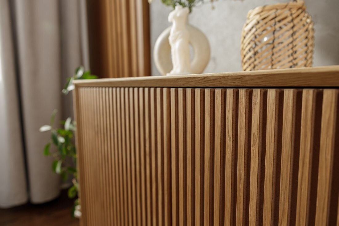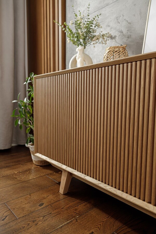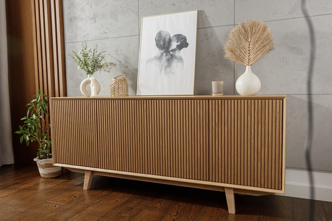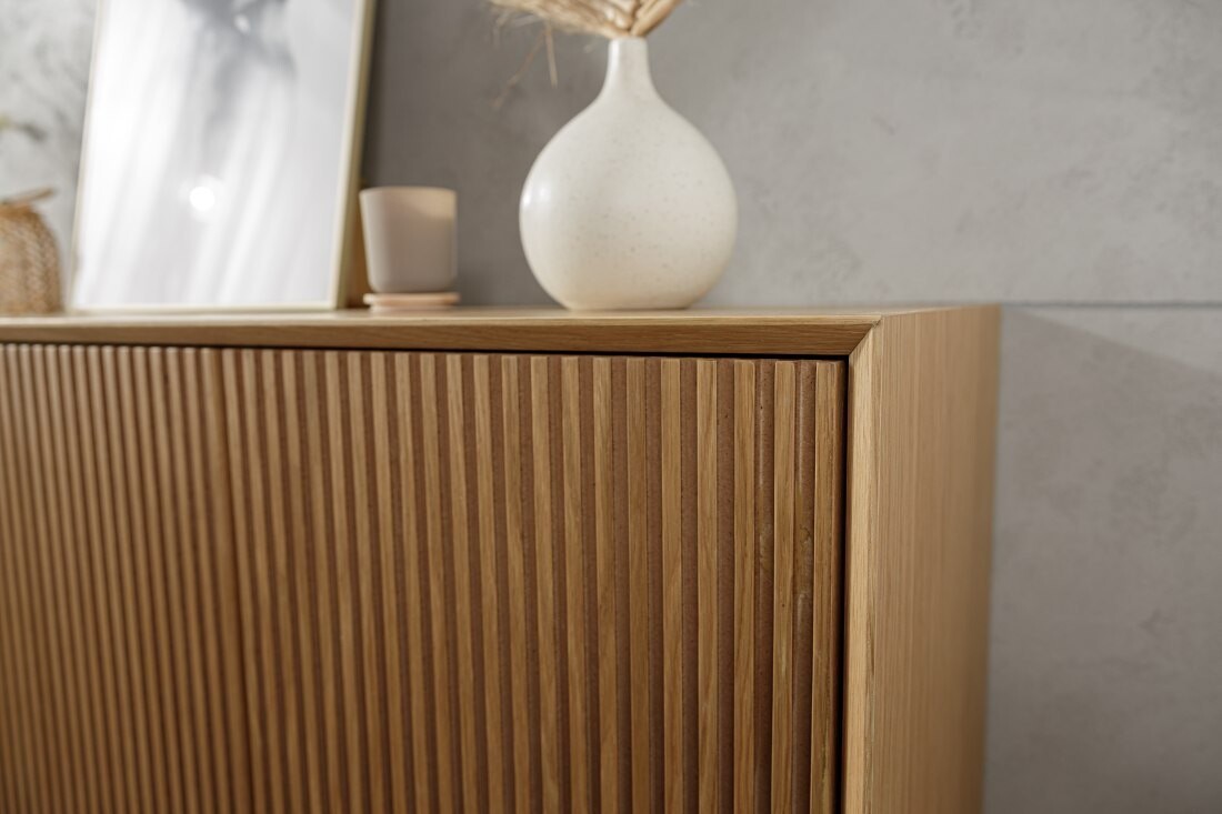 Komoda Nordik przykuwa uwagę rytmem pionowych ryflowań, które precyzyjnie pokrywają całą powierzchnię frontów. Smukłe frezy nadają meblowi wyjątkowy, trójwymiarowy charakter, tworząc subtelny efekt światłocienia. Dzięki temu komoda zyskuje nowoczesną elegancję, a jednocześnie nie traci naturalnego ciepła drewna. Delikatny odcień dębu i surowa linia bryły harmonizują z wysokimi, drewnianymi nogami, które podnoszą korpus, dodając mu lekkości i ułatwiając zachowanie porządku w przestrzeni wokół mebla.