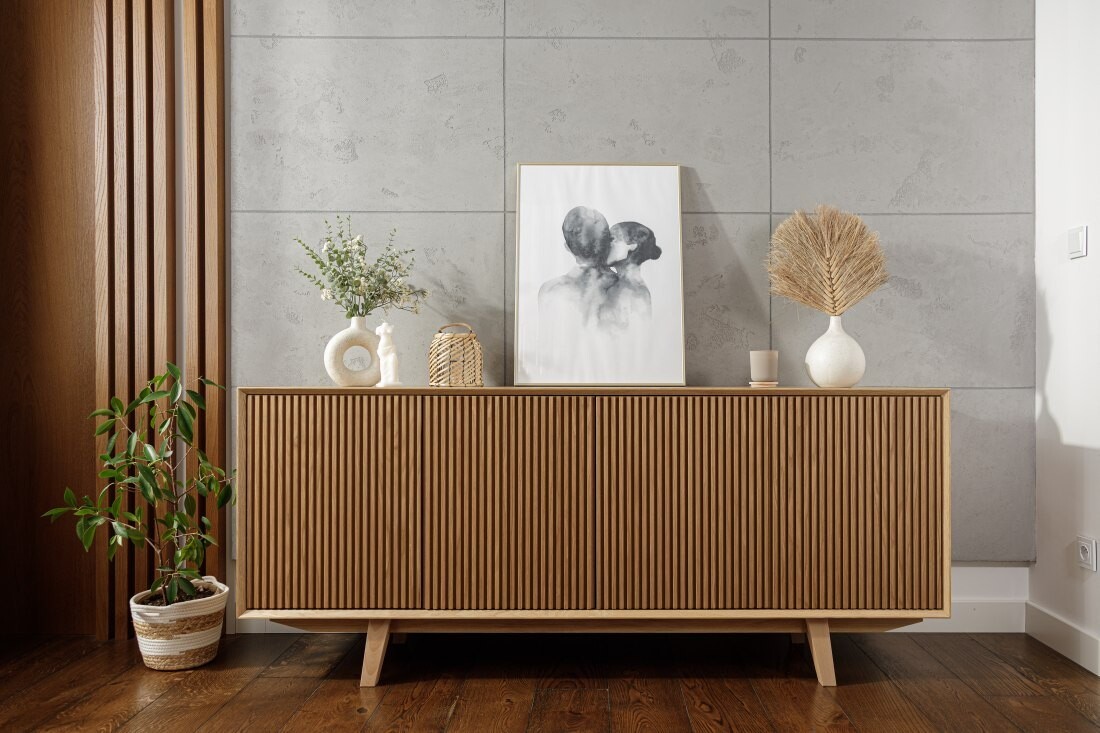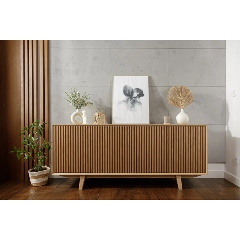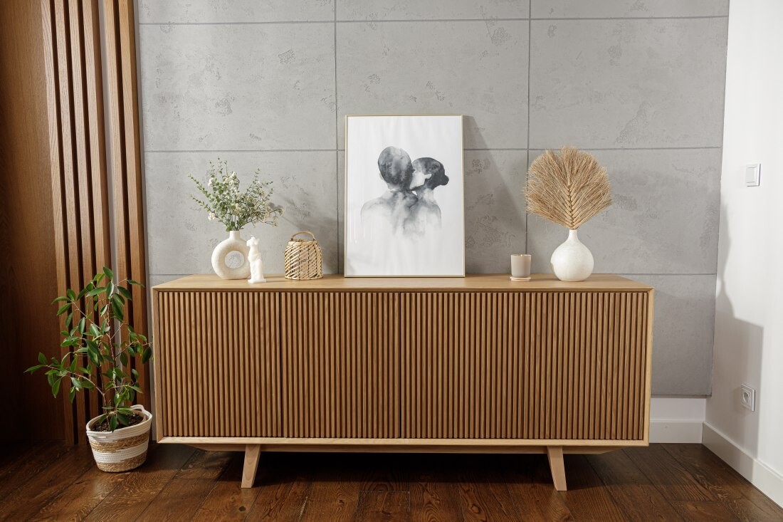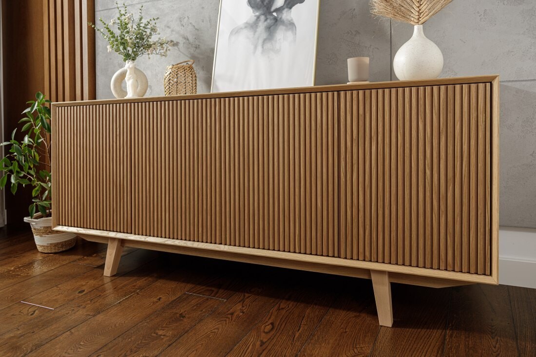Komoda Nordik przykuwa uwagę rytmem pionowych ryflowań, które precyzyjnie pokrywają całą powierzchnię frontów. Smukłe frezy nadają meblowi wyjątkowy, trójwymiarowy charakter, tworząc subtelny efekt światłocienia. Dzięki temu komoda zyskuje nowoczesną elegancję, a jednocześnie nie traci naturalnego ciepła drewna. Delikatny odcień dębu i surowa linia bryły harmonizują z wysokimi, drewnianymi nogami, które podnoszą korpus, dodając mu lekkości i ułatwiając zachowanie porządku w przestrzeni wokół mebla.