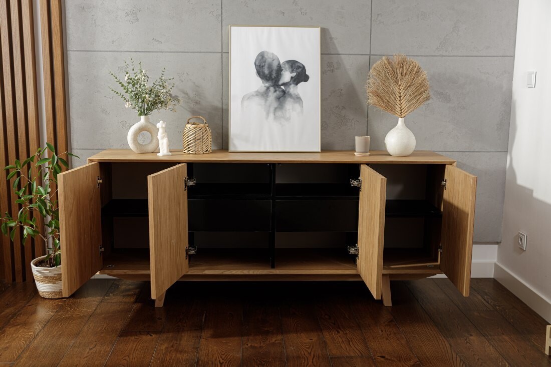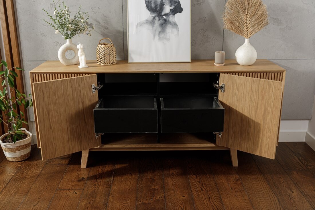 Zastosowany system push-open z zawiasami Blum pozwala na pełne otwieranie frontów bez potrzeby stosowania uchwytów, co podkreśla czystą formę komody i wpisuje się w stylistykę minimalizmu. Fronty wykonano z frezowanego forniru dębowego, który zachowuje naturalną fakturę drewna, wzmacniając autentyczny wygląd mebla. Korpus fornirowany tym samym materiałem utrzymuje spójność wykończenia, a proporcje komody – 187 cm szerokości przy 46 cm głębokości – oferują pojemne wnętrze, idealne do przechowywania zarówno naczyń, jak i dokumentów czy tekstyliów.