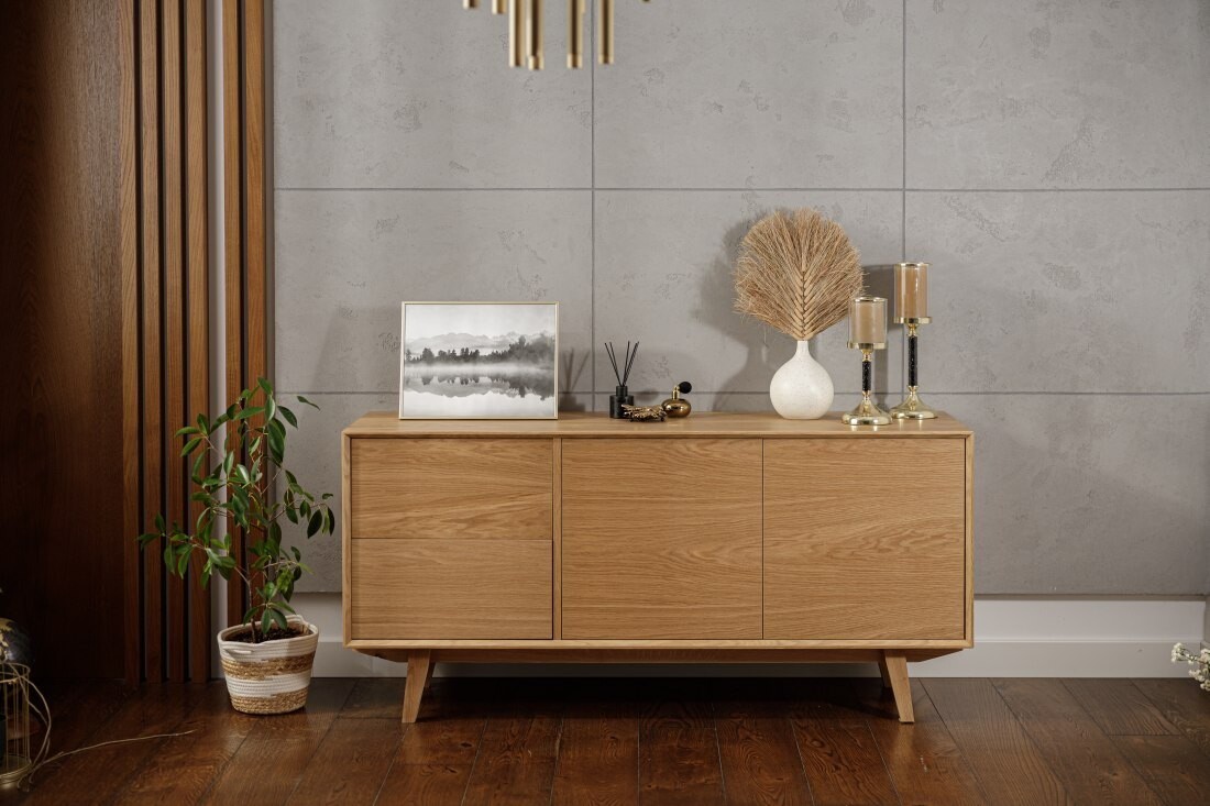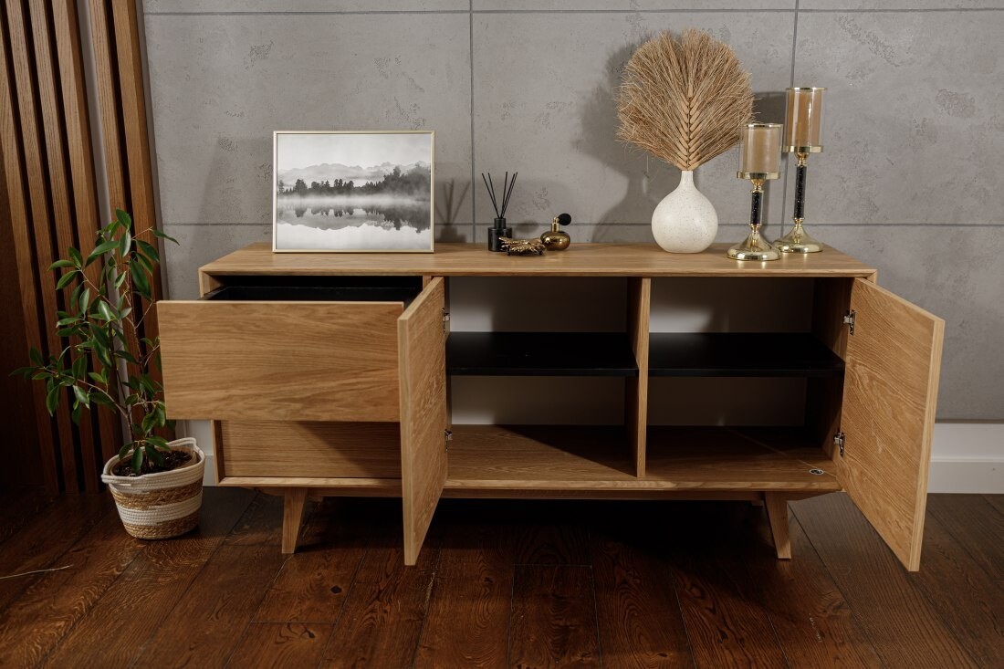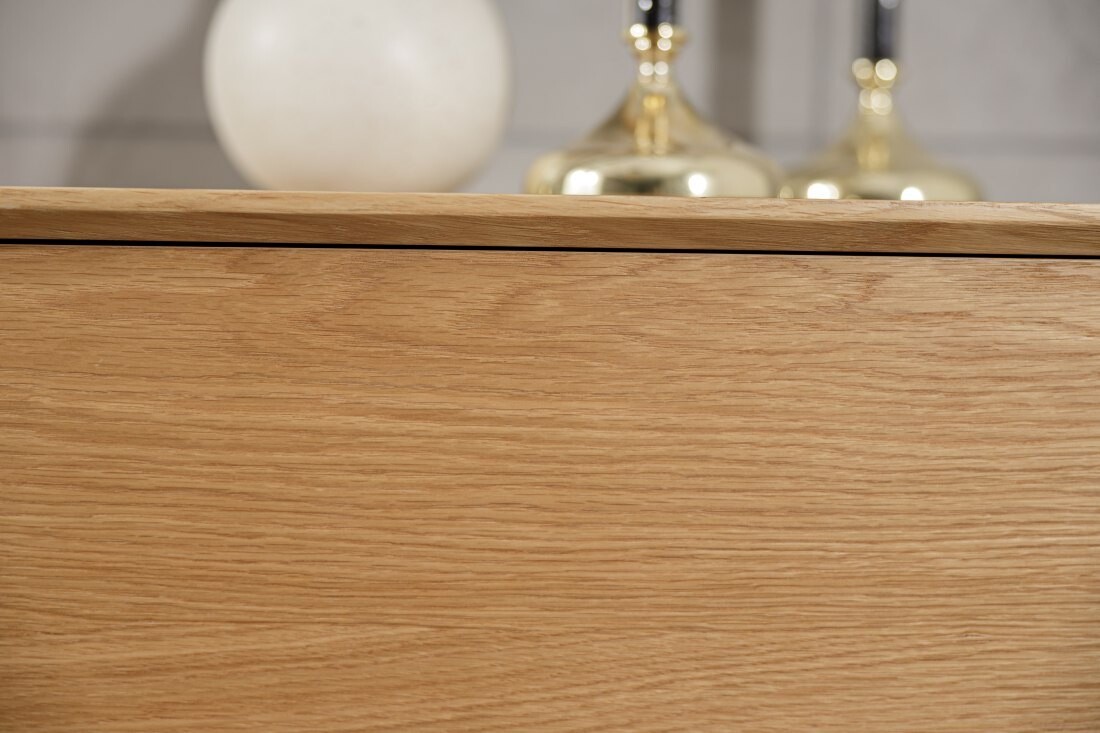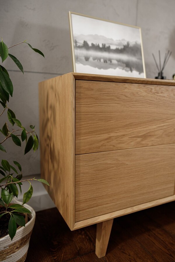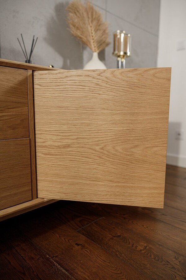 Mebel został wyposażony w system push-open z niezawodnymi zawiasami Blum, który zapewnia komfortowe i płynne otwieranie drzwiczek i szuflad przy delikatnym naciśnięciu. Lewa strona komody mieści dwie praktyczne szuflady oraz szafkę, natomiast prawa część skrywa dwie przestronne komory za pełnymi frontami. Zarówno korpus, jak i fronty wykonano z wysokiej jakości płyt fornirowanych naturalnym dębem, co gwarantuje trwałość oraz estetykę zbliżoną do litego drewna. Wykończenie bez widocznych okuć wzmacnia minimalistyczny charakter mebla, podkreślając jego szlachetną prostotę.